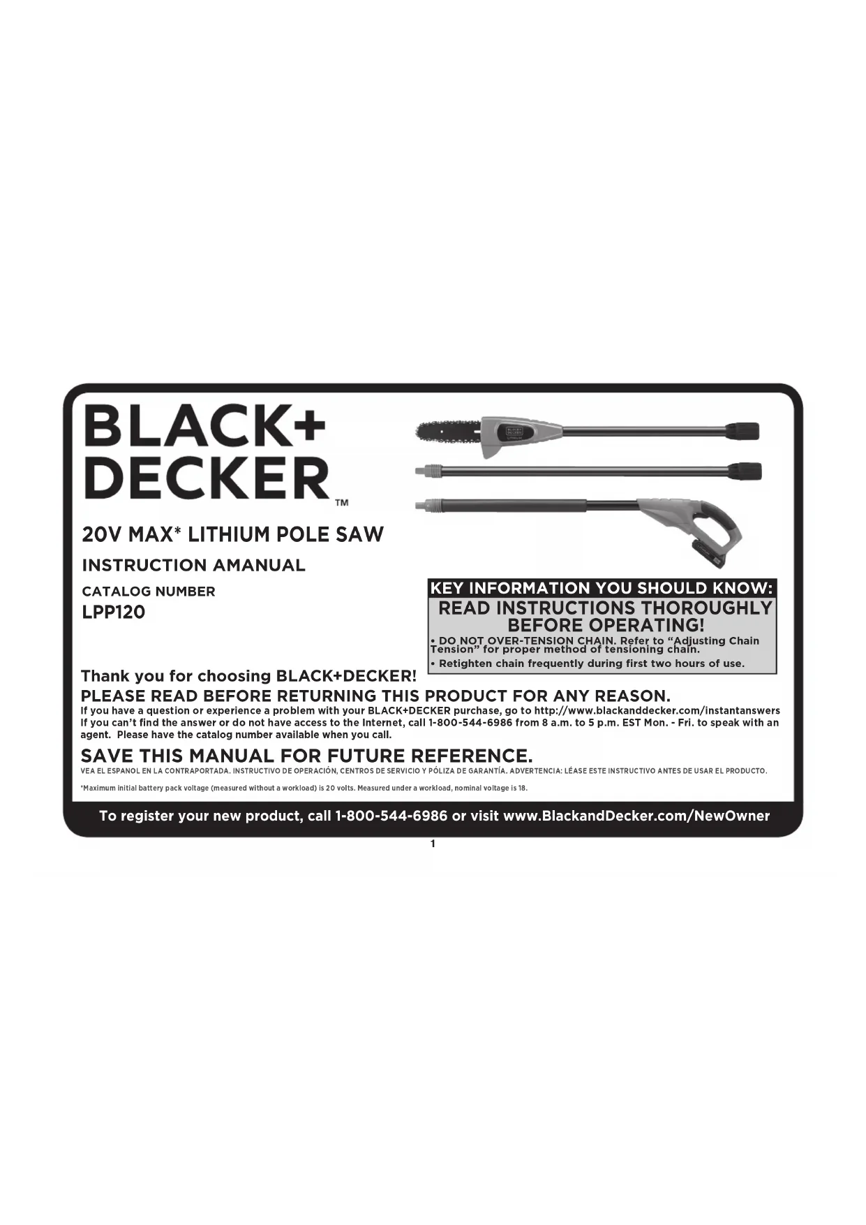 Thank you for choosing BLACK+DECKER! PLEASE READ BEFORE RETURNING THIS PRODUCT FOR ANY REASON. If you have a question or experience a problem with your BLACK+DECKER purchase, go to http://www.blackanddecker.com/instantanswers If you can’t find the answer or do not have access to the Internet, call 1-800-544-6986 from 8 a.m. to 5 p.m. EST Mon. - Fri. to speak with an agent. Please have the catalog number available when you call. SAVE THIS MANUAL FOR FUTURE REFERENCE. VEA EL ESPANOL EN LA CONTRAPORTADA. INSTRUCTIVO DE OPERACIÓN, CENTROS DE SERVICIO Y PÓLIZA DE GARANTÍA. ADVERTENCIA: LÉASE ESTE INSTRUCTIVO ANTES DE USAR EL PRODUCTO. *Maximum initial battery pack voltage (measured without a workload) is 20 volts. Measured under a workload, nominal voltage is 18. To register your new product, call 1-800-544-6986 or visit www.BlackandDecker.com/NewOwner KEY INFORMATION YOU SHOULD KNOW: