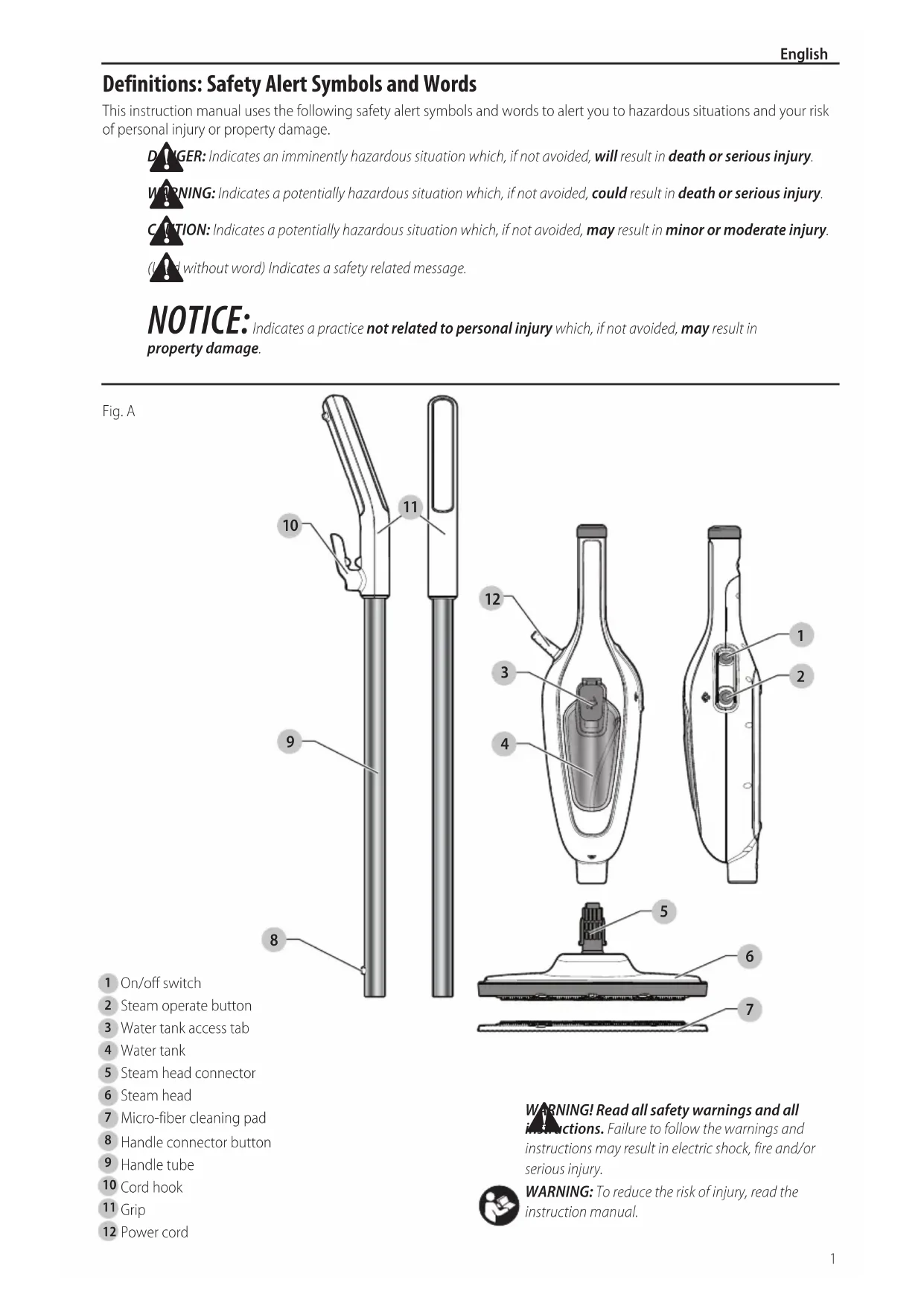 Power cord Fig. A Definitions: Safety Alert Symbols and Words This instruction manual uses the following safety alert symbols and words to alert you to hazardous situations and your risk of personal injury or property damage.