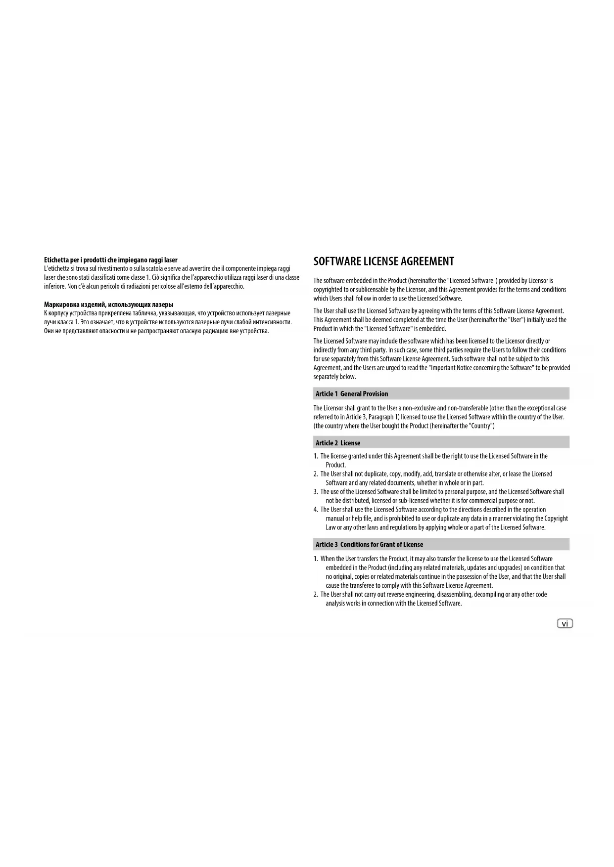 The software embedded in the Product (hereinafter the "Licensed Software") provided by Licensor is copyrighted to or sublicensable by the Licensor, and this Agreement provides for the terms and conditions which Users shall follow in order to use the Licensed Software. The User shall use the Licensed Software by agreeing with the terms of this Software License Agreement. This Agreement shall be deemed completed at the time the User (hereinafter the "User") initially used the Product in which the "Licensed Software" is embedded. The Licensed Software may include the software which has been licensed to the Licensor directly or indirectly from any third party. In such case, some third parties require the Users to follow their conditions for use separately from this Software License Agreement. Such software shall not be subject to this Agreement, and the Users are urged to read the "Important Notice concerning the Software" to be provided separately below. Article 1 General Provision The Licensor shall grant to the User a non-exclusive and non-transferable (other than the exceptional case referred to in Article 3, Paragraph 1) licensed to use the Licensed Software within the country of the User. (the country where the User bought the Product (hereinafter the "Country") Article 2 License