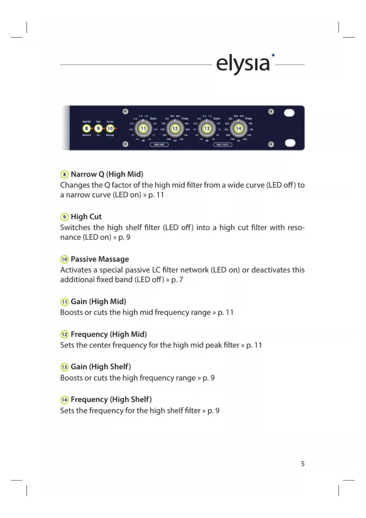 Gain (Low Shelf) Boosts or cuts the low frequency range » p. 8 Frequency (Low Shelf) Sets the frequency for the low shelf lter » p. 8 Gain (Low Mid) Boosts or cuts the low mid frequency range » p. 10 Frequency (Low Mid) Sets the center frequency for the low mid peak lter » p. 10 Hit It! Activates the xlter (LED on) or deactivates it with a hardwire bypass (LED o) Low Cut Switches the low shelf lter (LED o) into a low cut lter with resonance (LED on) » p. 8 Narrow Q (Low Mid) Changes the Q factor of the low mid lter from a wide curve (LED o) to a narrow curve (LED on) » p. 10-5.0 -9.0