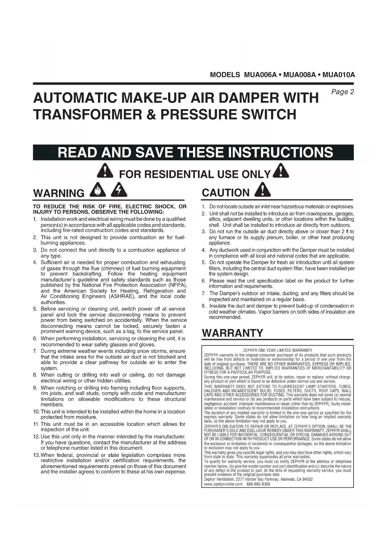 ZEPHYR warrants to the original consumer purchaser of its products that such products will be free from defects in materials or workmanship for a period of one year from the date of original purchase. THERE ARE NO OTHER WARRANTIES, EXPRESS OR IMPLIED, INCLUDING, BUT NOT LIMITED TO, IMPLIED WARRANTIES OF MERCHANTABILITY OR FITNESS FOR A PARTICULAR PURPOSE. During this one-year period, ZEPHYR will, at its option, repair or replace, without charge, any product or part which is found to be defective under normal use and service. THIS WARRANTY DOES NOT EXTEND TO FLUORESCENT LAMP STARTERS, TUBES, HALOGEN AND INCANDESCENT BULBS, FUSES, FILTERS, DUCTS, ROOF CAPS, WALL CAPS AND OTHER ACCESSORIES FOR DUCTING. This warranty does not cover (a) normal maintenance and service or (b) any products or parts which have been subject to misuse, negligence, accident, improper maintenance or repair (other than by ZEPHYR), faulty instal- lation or installation contrary to recommended installation instructions. The duration of any implied warranty is limited to the one-year period as specified for the express warranty. Some states do not allow limitation on how long an implied warranty lasts, so the above limitation may not apply to you. ZEPHYR’S OBLIGATION TO REPAIR OR REPLACE, AT ZEPHYR’S OPTION, SHALL BE THE PURCHASER’S SOLE AND EXCLUSIVE REMEDY UNDER THIS WARRANTY. ZEPHYR SHALL NOT BE LIABLE FOR INCIDENTAL, CONSEQUENTIAL OR SPECIAL DAMAGES ARISING OUT OF OR IN CONNECTION WITH PRODUCT USE OR PERFORMANCE. Some states do not allow the exclusion or limitation of incidental or consequential damages, so the above limitation or exclusion may not apply to you. This warranty gives you specific legal rights, and you may also have other rights, which vary from state to state. This warranty supersedes all prior warranties. To qualify for warranty service, you must (a) notify ZEPHYR at the address or telephone number below, (b) give the model number and part identification and (c) describe the nature of any defect in the product or part. At the time of requesting warranty service, you must present evidence of the original purchase date. Zephyr Ventilation, 2277 Harbor Bay Parkway, Alameda, CA 94502 www.zephyronline.com 888-880-8368MODELS MUA006A • MUA008A • MUA010A Page 3