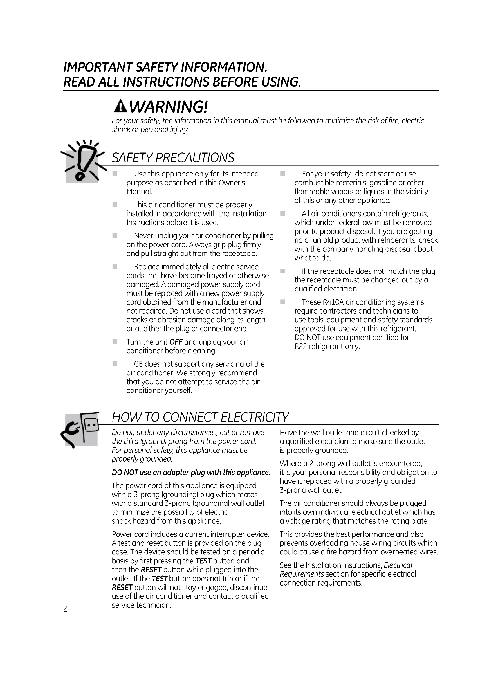 guidelines for energy efficiency.*EnErgy Star labeled product Climatiseur Acondicionador de aire Manuel d’utilisation et instructions d’installation Manual del propietario y instrucciones de instalación La section française commence à la page 17La sección en español empieza en la página 33In Canada, contact us at: www.GEAppliances.ca2 IMPORTANT SAFETY INFORMATION. READ ALL INSTRUCTIONS BEFORE USING. WARNING! For your safety, the information in this manual must be followed to minimize the risk of fire, electric shock or personal injury. n Use this appliance only for its intended purpose as described in this Owner’s Manual. n This air conditioner must be properly installed in accordance with the Installation Instructions before it is used. n Never unplug your air conditioner by pulling on the power cord. Always grip plug firmly and pull straight out from the receptacle. n Replace immediately all electric service cords that have become frayed or otherwise damaged. A damaged power supply cord must be replaced with a new power supply cord obtained from the manufacturer and not repaired. Do not use a cord that shows cracks or abrasion damage along its length or at either the plug or connector end. n Turn the unit OFF and unplug your air conditioner before cleaning. n GE does not support any servicing of the air conditioner. We strongly recommend that you do not attempt to service the air conditioner yourself. n For your safety…do not store or use combustible materials, gasoline or other flammable vapors or liquids in the vicinity of this or any other appliance. n All air conditioners contain refrigerants, which under federal law must be removed prior to product disposal. If you are getting rid of an old product with refrigerants, check with the company handling disposal about what to do. n If the receptacle does not match the plug, the receptacle must be changed out by a qualified electrician. n These R410A air conditioning systems require contractors and technicians to use tools, equipment and safety standards approved for use with this refrigerant. DO NOT use equipment certified for R22 refrigerant only. SAFETY PRECAUTIONS Do not, under any circumstances, cut or remove the third (ground) prong from the power cord. For personal safety, this appliance must be properly grounded. DO NOT use an adapter plug with this appliance. The power cord of this appliance is equipped with a 3-prong (grounding) plug which mates with a standard 3-prong (grounding) wall outlet to minimize the possibility of electric shock hazard from this appliance. Power cord includes a current interrupter device. A test and reset button is provided on the plug case. The device should be tested on a periodic basis by first pressing the TEST button and then the RESET button while plugged into the outlet. If the TEST button does not trip or if the RESET button will not stay engaged, discontinue use of the air conditioner and contact a qualified service technician. Have the wall outlet and circuit checked by a qualified electrician to make sure the outlet is properly grounded. Where a 2-prong wall outlet is encountered, it is your personal responsibility and obligation to have it replaced with a properly grounded 3-prong wall outlet. The air conditioner should always be plugged into its own individual electrical outlet which has a voltage rating that matches the rating plate. This provides the best performance and also prevents overloading house wiring circuits which could cause a fire hazard from overheated wires. See the Installation Instructions, Electrical Requirements section for specific electrical connection requirements.