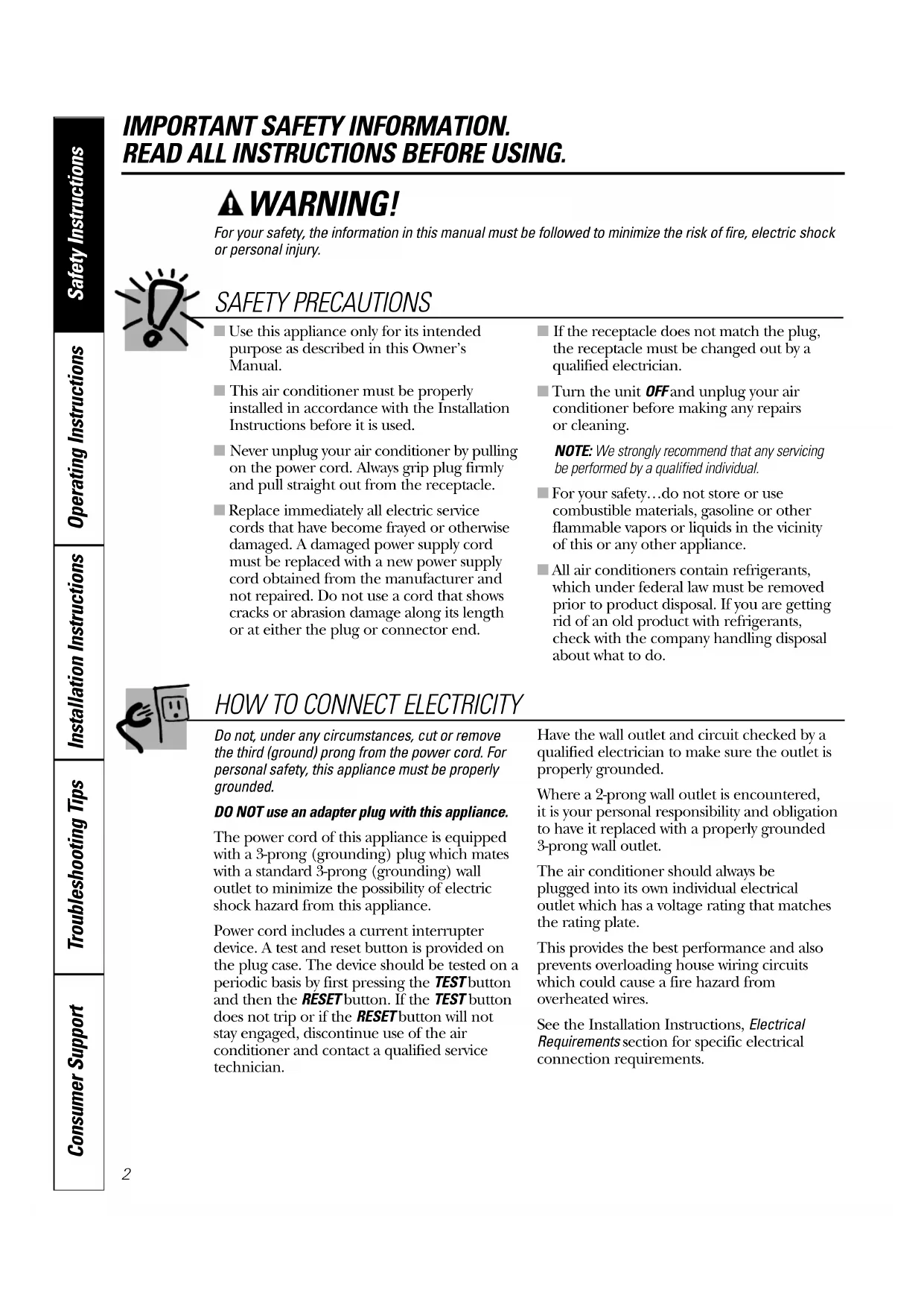 IMPORTANT SAFETY INFORMATION. READ ALL INSTRUCTIONS BEFORE USING. WARNING! For your safety, the information in this manual must be followed to minimize the risk of fire, electric shock or personal injury. ■ Use this appliance only for its intended purpose as described in this Owner’s Manual. ■ This air conditioner must be properly installed in accordance with the Installation Instructions before it is used. ■ Never unplug your air conditioner by pulling on the power cord. Always grip plug firmly and pull straight out from the receptacle. ■ Replace immediately all electric service cords that have become frayed or otherwise damaged. A damaged power supply cord must be replaced with a new power supply cord obtained from the manufacturer and not repaired. Do not use a cord that shows cracks or abrasion damage along its length or at either the plug or connector end. ■ If the receptacle does not match the plug, the receptacle must be changed out by a qualified electrician. ■ Turn the unit OFF and unplug your air conditioner before making any repairs or cleaning. NOTE: We strongly recommend that any servicing be performed by a qualified individual. ■ For your safety…do not store or use combustible materials, gasoline or other flammable vapors or liquids in the vicinity of this or any other appliance. ■ All air conditioners contain refrigerants, which under federal law must be removed prior to product disposal. If you are getting rid of an old product with refrigerants, check with the company handling disposal about what to do. SAFETY PRECAUTIONS Do not, under any circumstances, cut or remove the third (ground) prong from the power cord. For personal safety, this appliance must be properly grounded. DO NOT use an adapter plug with this appliance. The power cord of this appliance is equipped with a 3-prong (grounding) plug which mates with a standard 3-prong (grounding) wall outlet to minimize the possibility of electric shock hazard from this appliance. Power cord includes a current interrupter device. A test and reset button is provided on the plug case. The device should be tested on a periodic basis by first pressing the TEST button and then the RESET button. If the TEST button does not trip or if the RESET button will not stay engaged, discontinue use of the air conditioner and contact a qualified service technician. Have the wall outlet and circuit checked by a qualified electrician to make sure the outlet is properly grounded. Where a 2-prong wall outlet is encountered, it is your personal responsibility and obligation to have it replaced with a properly grounded 3-prong wall outlet. The air conditioner should always be plugged into its own individual electrical outlet which has a voltage rating that matches the rating plate. This provides the best performance and also prevents overloading house wiring circuits which could cause a fire hazard from overheated wires. See the Installation Instructions, Electrical Requirements section for specific electrical connection requirements.
