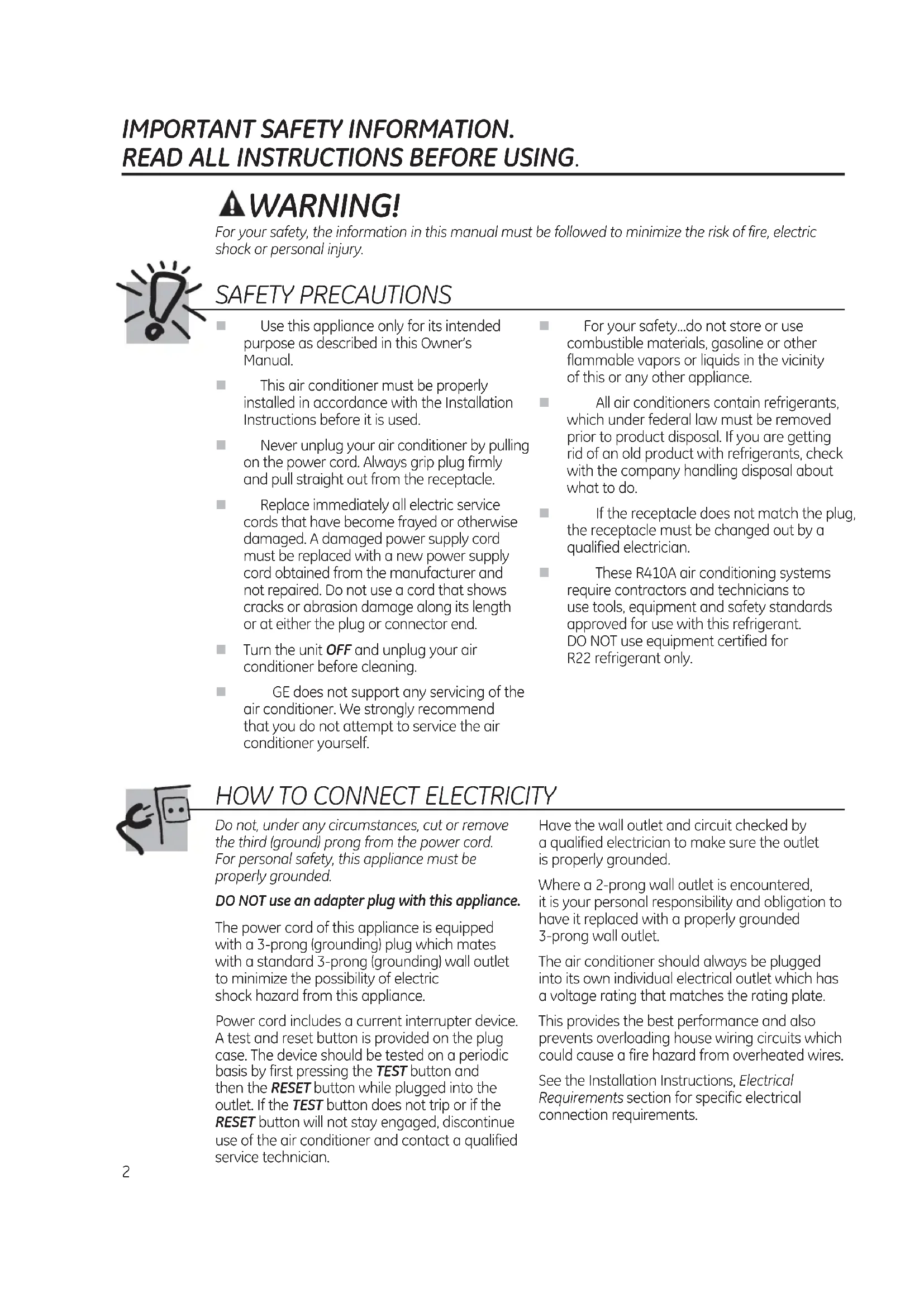 guidelines for energy efficiency.*ENERGY STAR labeled product Climatiseur Acondicionador de aire Manuel d’utilisation et instructions d’installation Manual del propietario y instrucciones de instalación La section française commence à la page 13La sección en español empieza en la página 272 IMPORTANT SAFETY INFORMATION. READ ALL INSTRUCTIONS BEFORE USING. WARNING! For your safety, the information in this manual must be followed to minimize the risk of fire, electric shock or personal injury. Use this appliance only for its intended purpose as described in this Owner’s Manual. This air conditioner must be properly installed in accordance with the Installation Instructions before it is used. Never unplug your air conditioner by pulling on the power cord. Always grip plug firmly and pull straight out from the receptacle. Replace immediately all electric service cords that have become frayed or otherwise damaged. A damaged power supply cord must be replaced with a new power supply cord obtained from the manufacturer and not repaired. Do not use a cord that shows cracks or abrasion damage along its length or at either the plug or connector end. Turn the unit OFF and unplug your air conditioner before cleaning. GE does not support any servicing of the air conditioner. We strongly recommend that you do not attempt to service the air conditioner yourself. For your safety…do not store or use combustible materials, gasoline or other flammable vapors or liquids in the vicinity of this or any other appliance. All air conditioners contain refrigerants, which under federal law must be removed prior to product disposal. If you are getting rid of an old product with refrigerants, check with the company handling disposal about what to do. If the receptacle does not match the plug, the receptacle must be changed out by a qualified electrician. These R410A air conditioning systems require contractors and technicians to use tools, equipment and safety standards approved for use with this refrigerant. DO NOT use equipment certified for R22 refrigerant only. SAFETY PRECAUTIONS Do not, under any circumstances, cut or remove the third (ground) prong from the power cord. For personal safety, this appliance must be properly grounded. DO NOT use an adapter plug with this appliance. The power cord of this appliance is equipped with a 3-prong (grounding) plug which mates with a standard 3-prong (grounding) wall outlet to minimize the possibility of electric shock hazard from this appliance. Power cord includes a current interrupter device. A test and reset button is provided on the plug case. The device should be tested on a periodic basis by first pressing the TEST button and then the RESET button while plugged into the outlet. If the TEST button does not trip or if the RESET button will not stay engaged, discontinue use of the air conditioner and contact a qualified service technician. Have the wall outlet and circuit checked by a qualified electrician to make sure the outlet is properly grounded. Where a 2-prong wall outlet is encountered, it is your personal responsibility and obligation to have it replaced with a properly grounded 3-prong wall outlet. The air conditioner should always be plugged into its own individual electrical outlet which has a voltage rating that matches the rating plate. This provides the best performance and also prevents overloading house wiring circuits which could cause a fire hazard from overheated wires. See the Installation Instructions, Electrical Requirements section for specific electrical connection requirements.