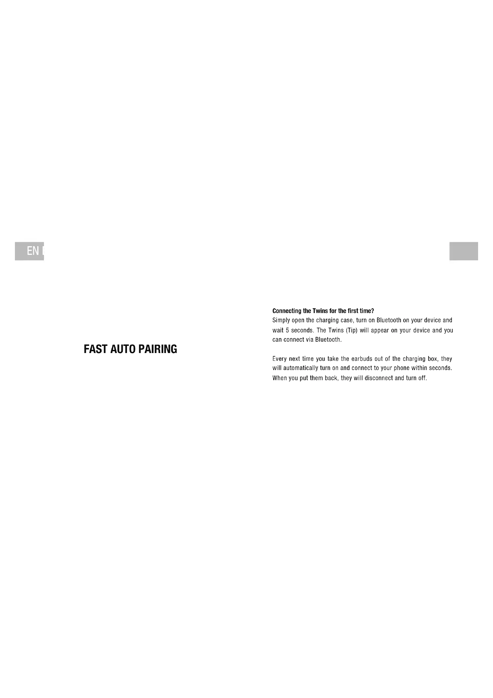 USER MANUALConnecting the Twins for the rst time? Simply open the charging case, turn on Bluetooth on your device and wait 5 seconds. The Twins (Tip) will appear on your device and you can connect via Bluetooth. Every next time you take the earbuds out of the charging box, they will automatically turn on and connect to your phone within seconds. When you put them back, they will disconnect and turn off.