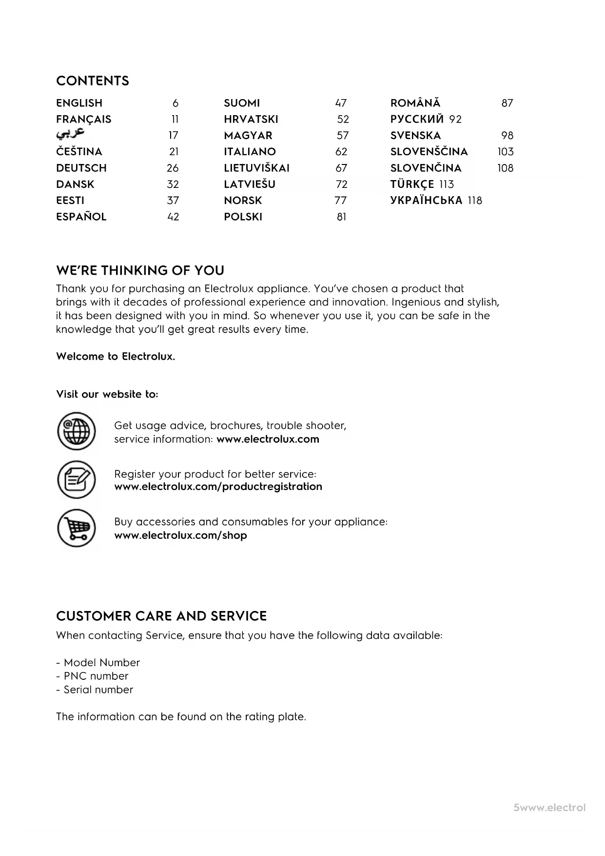 135www.electrolux.com Visit our website to: Get usage advice, brochures, trouble shooter, service information: www.electrolux.com Register your product for better service: www.electrolux.com/productregistration Buy accessories and consumables for your appliance: www.electrolux.com/shop CONTENTS ENGLISH 6 FRANÇAIS 11