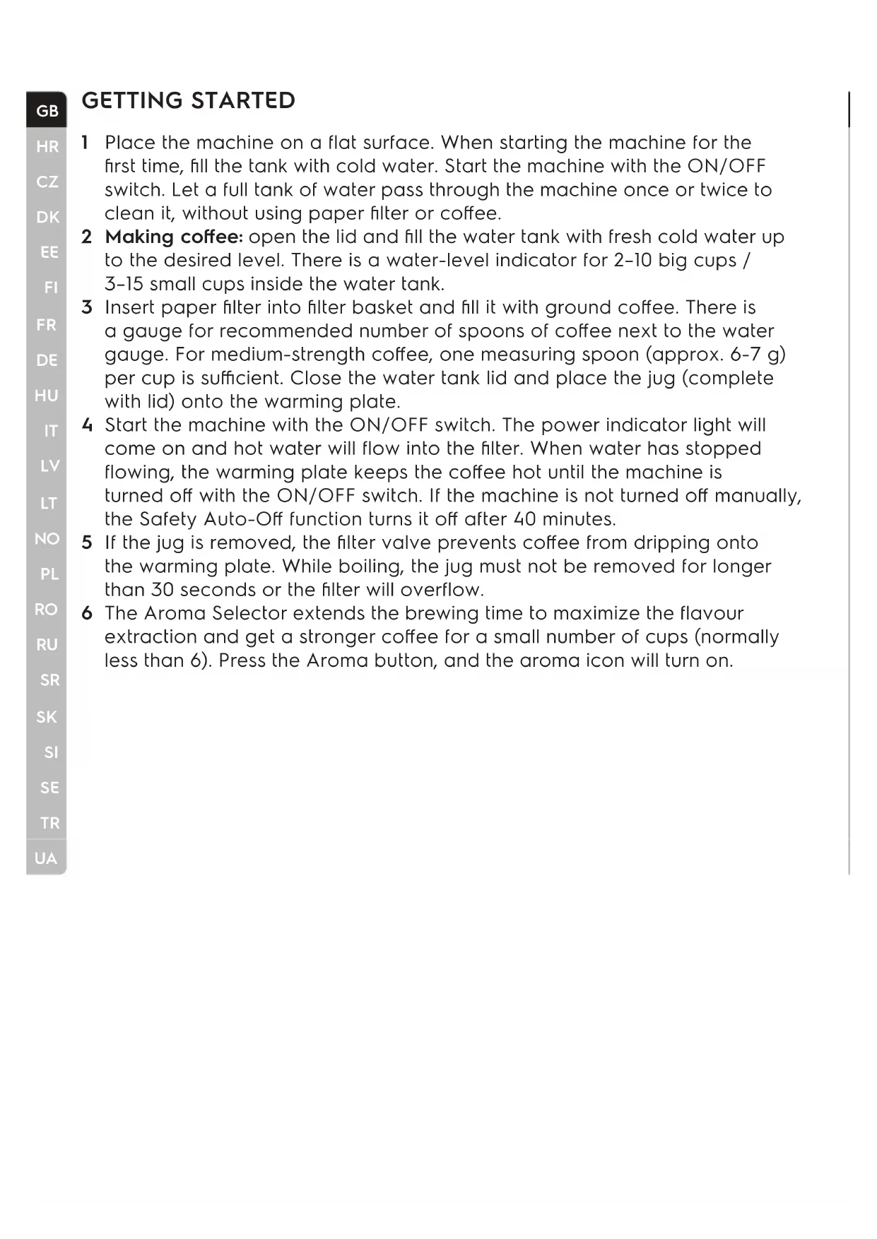 Place the machine on a flat surface. When starting the machine for the first time, fill the tank with cold water. Start the machine with the ON/OFF switch. Let a full tank of water pass through the machine once or twice to clean it, without using paper filter or coffee. Making coffee: open the lid and fill the water tank with fresh cold water up to the desired level. There is a water-level indicator for 2–10 big cups / 3–15 small cups inside the water tank. Insert paper filter into filter basket and fill it with ground coffee. There is a gauge for recommended number of spoons of coffee next to the water gauge. For medium-strength coffee, one measuring spoon (approx. 6-7 g) per cup is sufficient. Close the water tank lid and place the jug (complete with lid) onto the warming plate. Start the machine with the ON/OFF switch. The power indicator light will come on and hot water will flow into the filter. When water has stopped flowing, the warming plate keeps the coffee hot until the machine is turned off with the ON/OFF switch. If the machine is not turned off manually, the Safety Auto-Off function turns it off after 40 minutes. If the jug is removed, the filter valve prevents coffee from dripping onto the warming plate. While boiling, the jug must not be removed for longer than 30 seconds or the filter will overflow. The Aroma Selector extends the brewing time to maximize the flavour extraction and get a stronger coffee for a small number of cups (normally less than 6). Press the Aroma button, and the aroma icon will turn on.