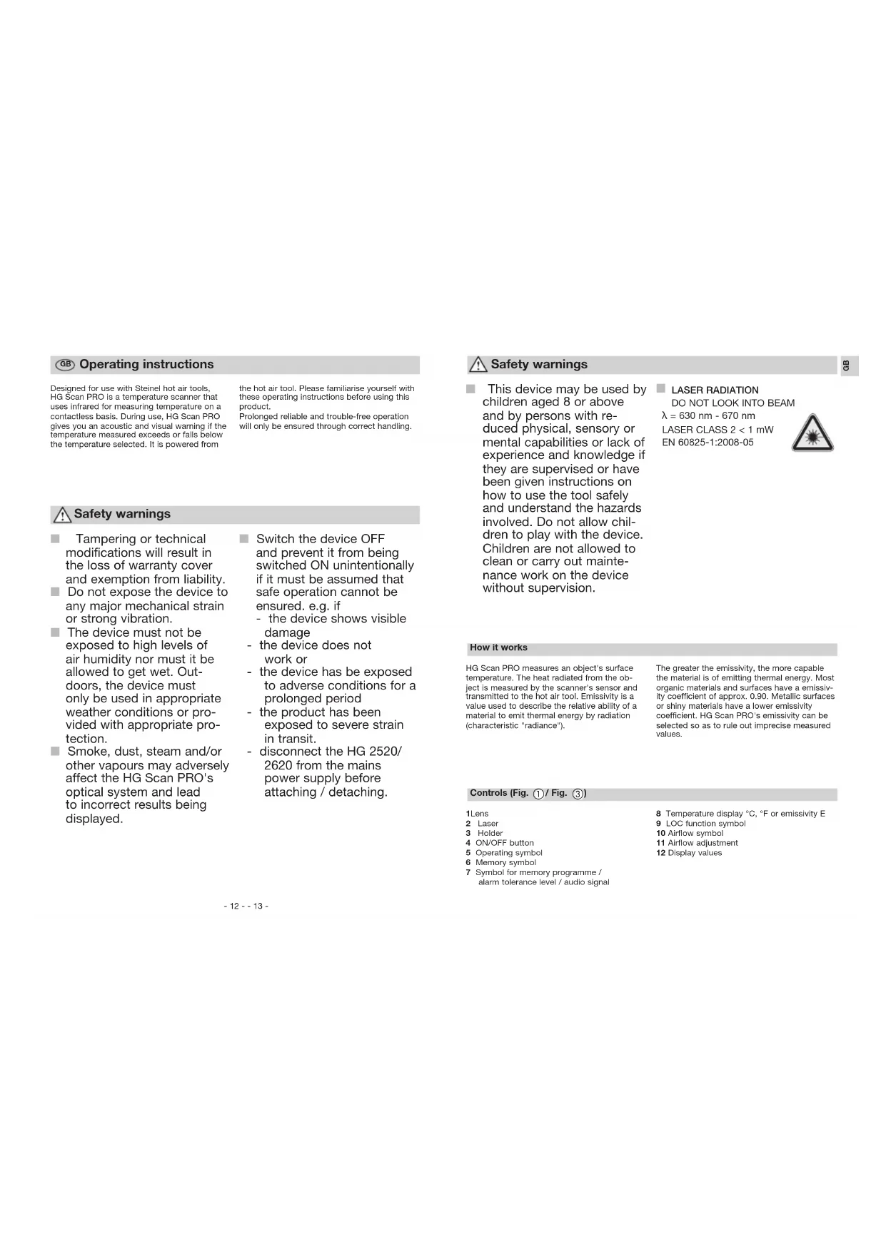 Designed for use with Steinel hot air tools, HGScanPRO is a temperature scanner that uses infrared for measuring temperature on a contactless basis. During use, HGScanPRO gives you an acoustic and visual warning if the temperature measured exceeds or falls below the temperature selected. It is powered from the hot air tool. Please familiarise yourself with these operating instructions before using this product. Prolonged reliable and trouble-free operation will only be ensured through correct handling. Controls (Fig. / Fig. ) 1 Lens 2 Laser 3 Holder 4 ON/OFF button 5 Operating symbol 6 Memory symbol 7 Symbol for memory programme / alarm tolerance level / audio signal 8 Temperature display °C, °F or emissivity E 9 LOC function symbol 10 Airflow symbol 11 Airflow adjustment 12 Display values HGScanPRO measures an object's surface temperature. The heat radiated from the ob- ject is measured by the scanner's sensor and transmitted to the hot air tool. Emissivity is a value used to describe the relative ability of a material to emit thermal energy by radiation (characteristic "radiance"). The greater the emissivity, the more capable the material is of emitting thermal energy. Most organic materials and surfaces have a emissiv- ity coefficient of approx. 0.90. Metallic surfaces or shiny materials have a lower emissivity coefficient. HGScanPRO's emissivity can be selected so as to rule out imprecise measured values. How it works ca- 14 - - 15 -