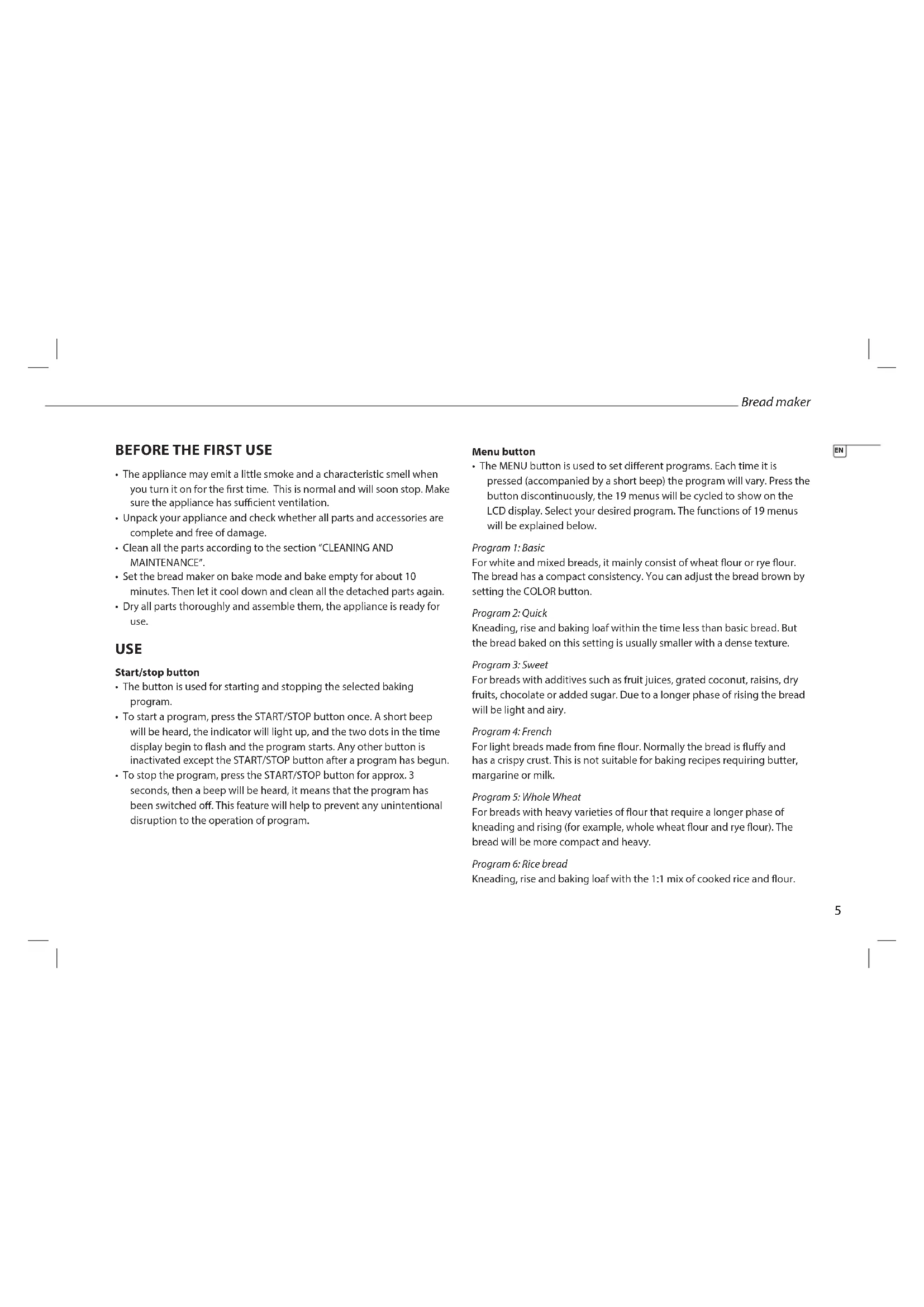 - The MENU button is used to set dierent programs. Each time it is pressed (accompanied by a short beep) the program will vary. Press the button discontinuously, the 19 menus will be cycled to show on the LCD display. Select your desired program. The functions of 19 menus will be explained below. Program 1: Basic For white and mixed breads, it mainly consist of wheat our or rye our. The bread has a compact consistency. You can adjust the bread brown by setting the COLOR button. Program 2: Quick Kneading, rise and baking loaf within the time less than basic bread. But the bread baked on this setting is usually smaller with a dense texture. Program 3: Sweet For breads with additives such as fruit juices, grated coconut, raisins, dry fruits, chocolate or added sugar. Due to a longer phase of rising the bread will be light and airy. Program 4: French For light breads made from ne our. Normally the bread is uy and has a crispy crust. This is not suitable for baking recipes requiring butter, margarine or milk. Program 5: Whole Wheat For breads with heavy varieties of our that require a longer phase of kneading and rising (for example, whole wheat our and rye our). The bread will be more compact and heavy. Program 6: Rice bread Kneading, rise and baking loaf with the 1:1 mix of cooked rice and our. Bread maker6 Program 7: Gluten free Kneading, rise and baking GLUTEN free loaf. Normally for: gluten free our, rice our, sweet potato our, corn our and oat our. Program 8: Dessert Kneading and baking those foods with more fat and protein. Program 9: Mix To make the our and water or some others can well commix. Program 10: Dough Kneading and rise, but without baking. Remove the dough and use for making bread rolls, pizza, steamed bread, etc. Program 11: Knead Setting the kneading time by user with dierent qty. Program 12: Cake Kneading, rise and baking, but rise with soda or baking powder. Program 13: Jam Boiling jams and marmalades. Program 14: Bake For additional baking of breads that are too light or not baked through. In this program there is no kneading or raising. Program 15: Yoghourt Rising and make the yoghourt. Program 16: Sticky rice Kneading and baking the mix of polished glutinous rice and rice. Program 17: Rice wine Rising and baking the polished glutinous rice. Program 18: Defrost Defrost those frost foods. Program 19: Stir-fry Kneading and baking some dry fruit, such as peanut, soybean etc. Color button