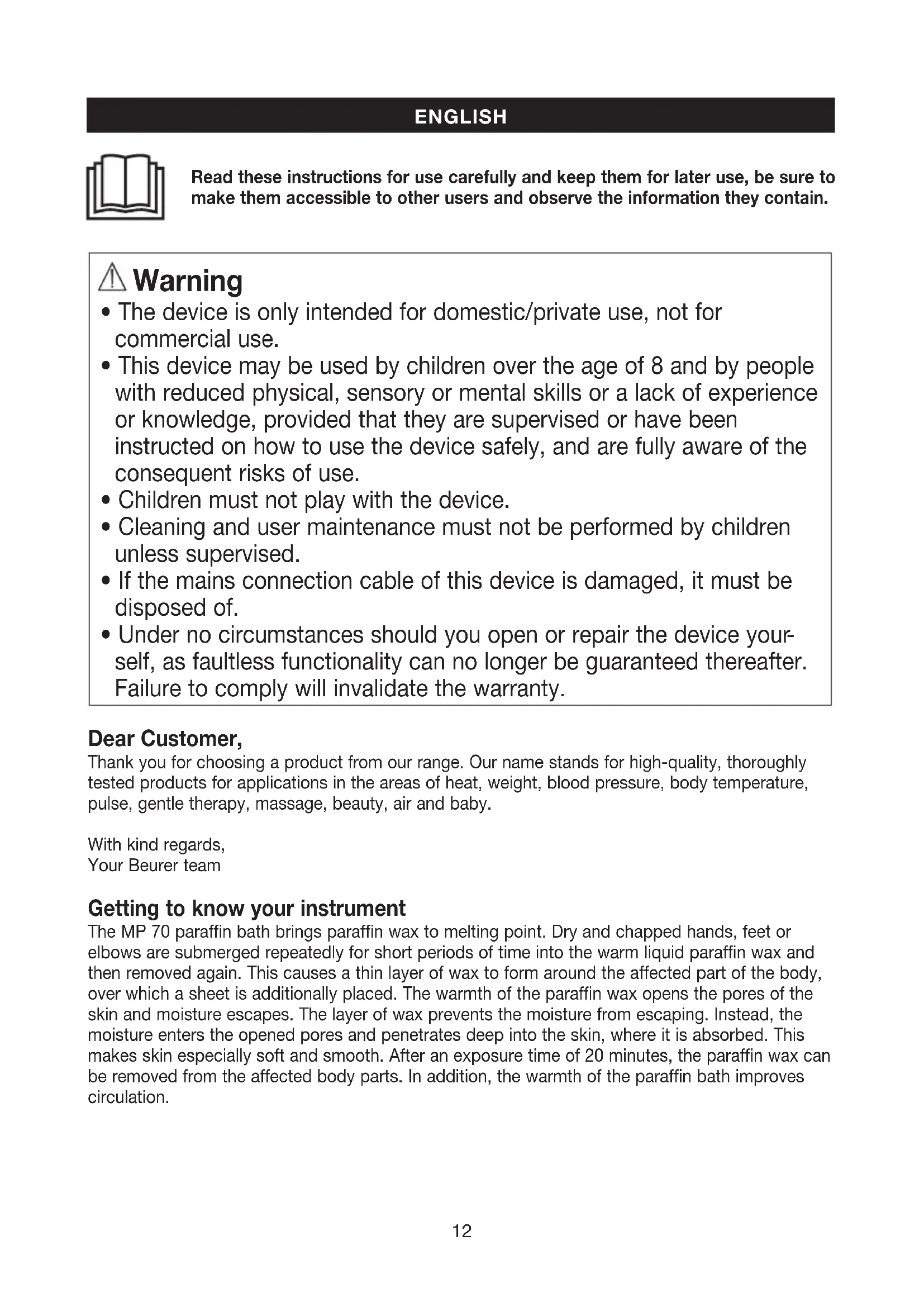 self, as faultless functionality can no longer be guaranteed thereafter. Failure to comply will invalidate the warranty. Dear Customer, Thank you for choosing a product from our range. Our name stands for high-quality, thoroughly tested products for applications in the areas of heat, weight, blood pressure, body temperature, pulse, gentle therapy, massage, beauty, air and baby. With kind regards, Your Beurer team Getting to know your instrument The MP 70 paraffin bath brings paraffin wax to melting point. Dry and chapped hands, feet or elbows are submerged repeatedly for short periods of time into the warm liquid paraffin wax and then removed again. This causes a thin layer of wax to form around the affected part of the body, over which a sheet is additionally placed. The warmth of the paraffin wax opens the pores of the skin and moisture escapes. The layer of wax prevents the moisture from escaping. Instead, the moisture enters the opened pores and penetrates deep into the skin, where it is absorbed. This makes skin especially soft and smooth. After an exposure time of 20 minutes, the paraffin wax can be removed from the affected body parts. In addition, the warmth of the paraffin bath improves circulation. ENGLISH Read these instructions for use carefully and keep them for later use, be sure to make them accessible to other users and observe the information they contain.13