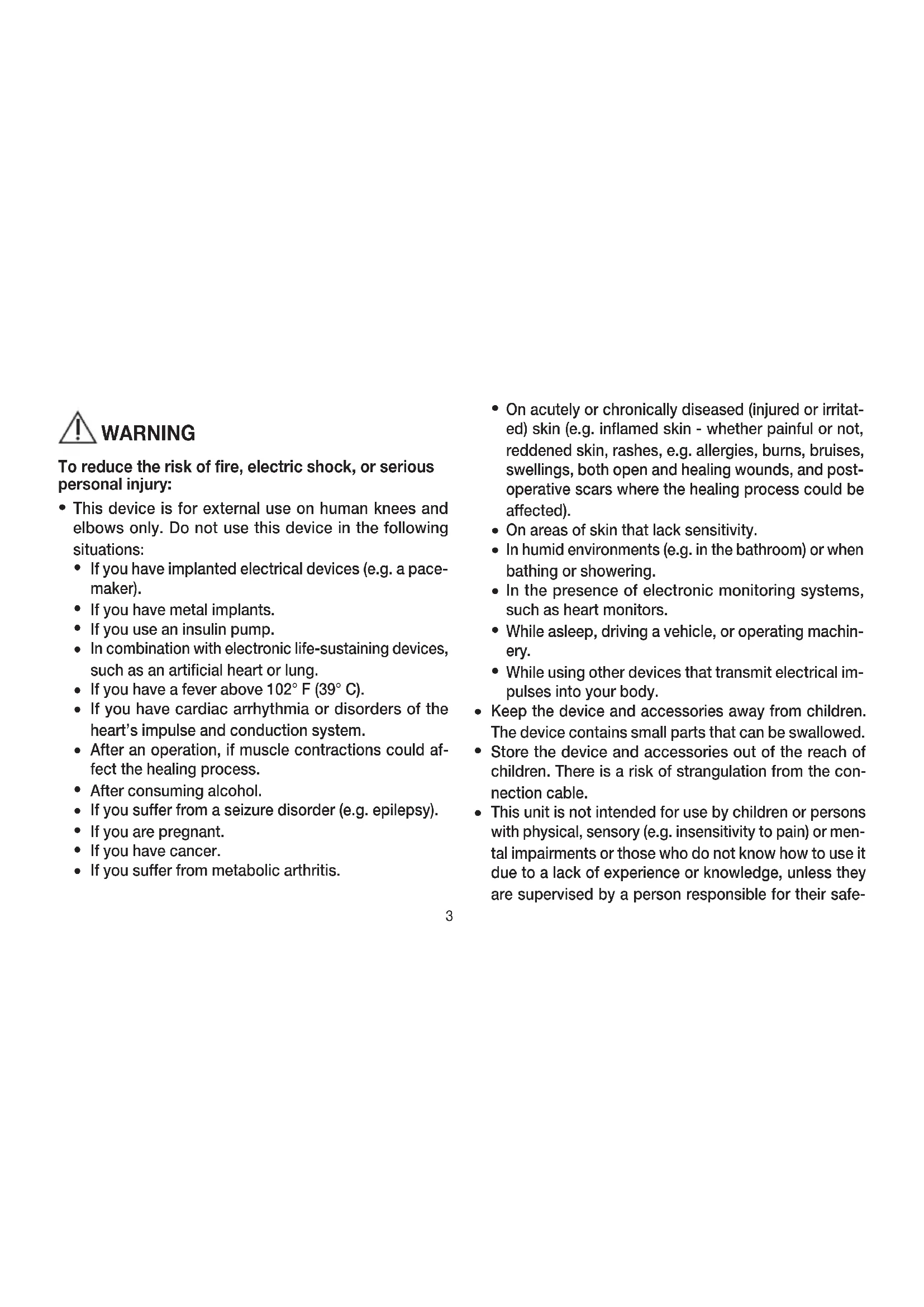 When should I use this device? Apply the cuff as soon as you feel pain in your knees/ elbows. If you begin using this device immediately, you can alleviate or even avoid chronic pain. The earlier you begin using the device, the higher the probability that pain can be alleviated. How often should I use the device? Do not use the device on a particular area more than three sessions per day, 30 minutes per session. Start the first treatment at low intensity until you are familiar with the de- vice. Stop treatment as soon as the pain has receded or disappeared. If, after using the device, you experience pain due to overexertion, stop use for two days. If you experience further pain due to overexertion, lower the intensity level during subsequent uses and reduce the treatment time. When should I stop using the device? Stop using the device if you feel a stabbing pain during stimulation. If you notice side-effects following use (skin irritation, reddening and burning of the skin, headache, feel- ing unwell), stop using the device. Stop using the device if pain does not improve after several treatments, becomes chronic or lasts for more than five days. What type of pain should I use the device for? The device works best to treat acute pain, meaning you can easily determine precisely where the pain is located. Acute pains are generally located in a specific area of the body and occur for less than three months. Chronic pain can occur in different parts of the body and over a period of six months or more. The device is unable to assist with chronic pain and you should consult a doctor instead. This device cannot treat injuries or the source of pain. It is intended only to provide short-term pain relief with the aim of improving your day-to-day life.13