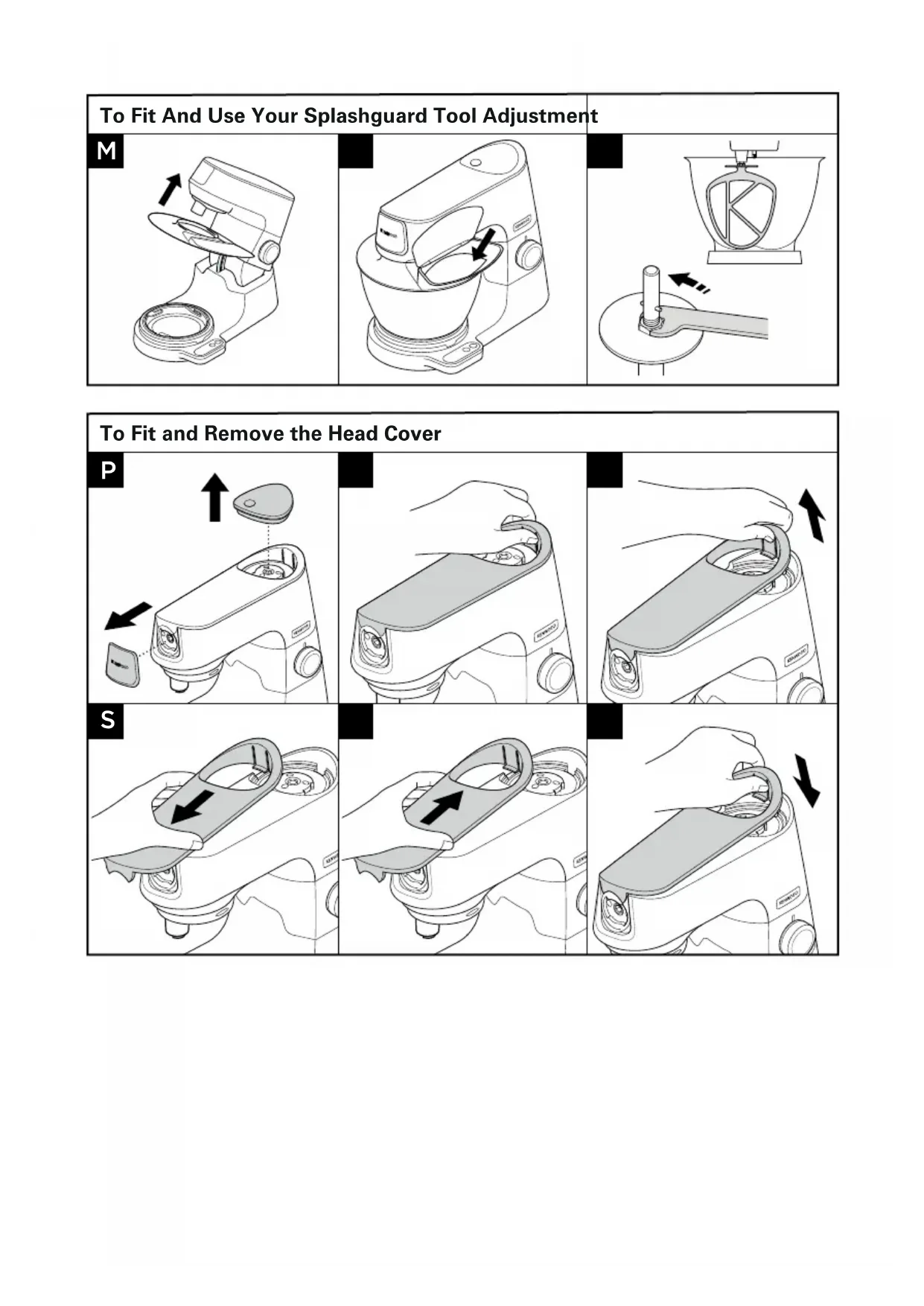 1 Raise the mixer head until it locks. 2 Fit the bowl onto the base. 3 Push the splashguard onto the underside of the mixer head until fully located. The hinged section should be positioned as shown. 4 Insert required tool. 5 Lower the mixer head.