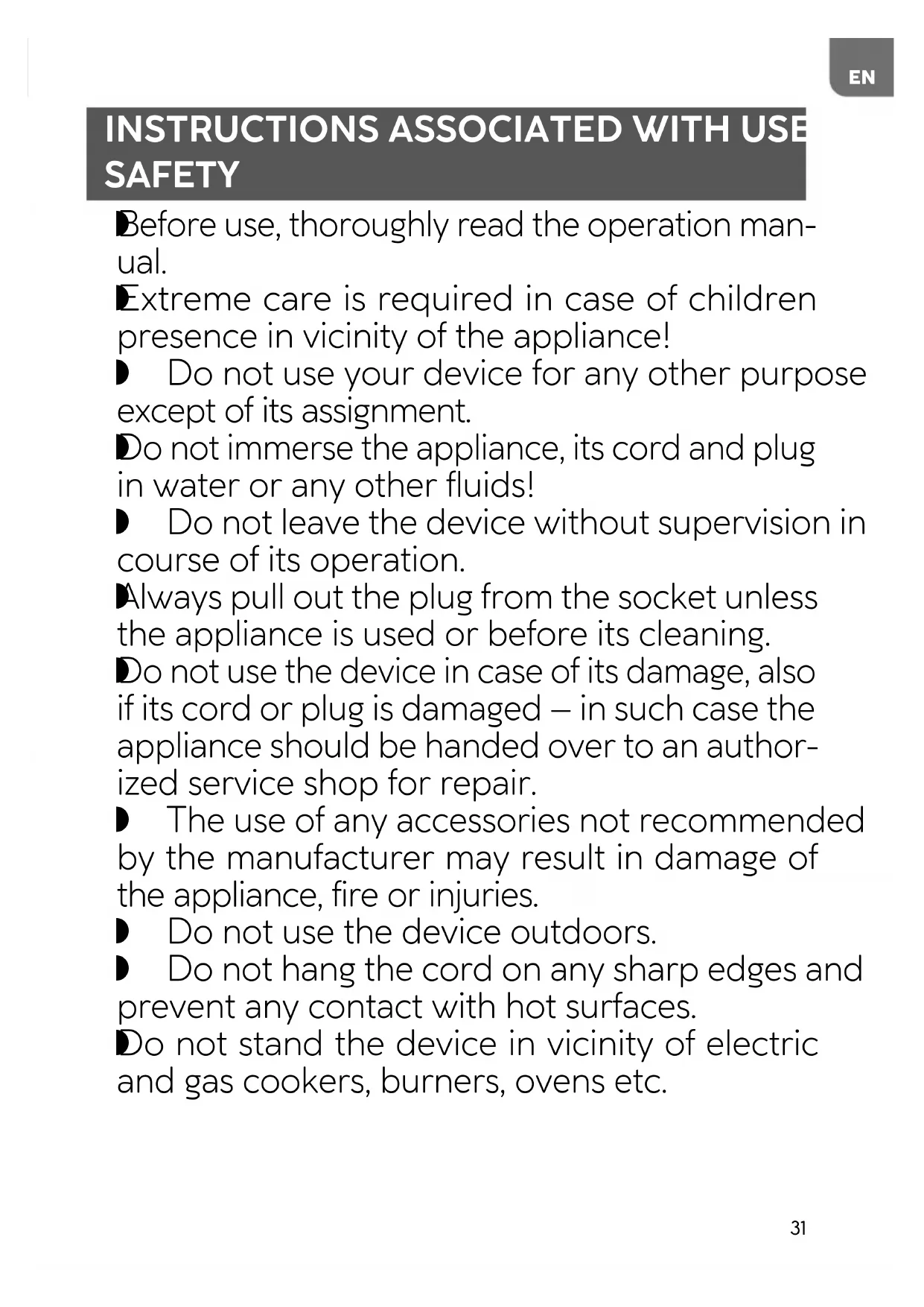 Do not use the device in case of its damage, also if its cord or plug is damaged – in such case the appliance should be handed over to an author- ized service shop for repair. The use of any accessories not recommended by the manufacturer may result in damage of the appliance, fire or injuries. Do not use the device outdoors. Do not hang the cord on any sharp edges and prevent any contact with hot surfaces.