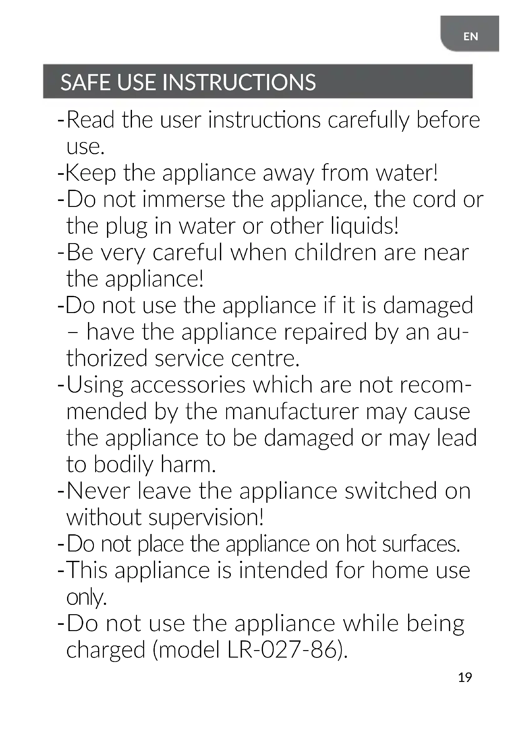 Do not use the appliance while being charged (model LR-027-86).20