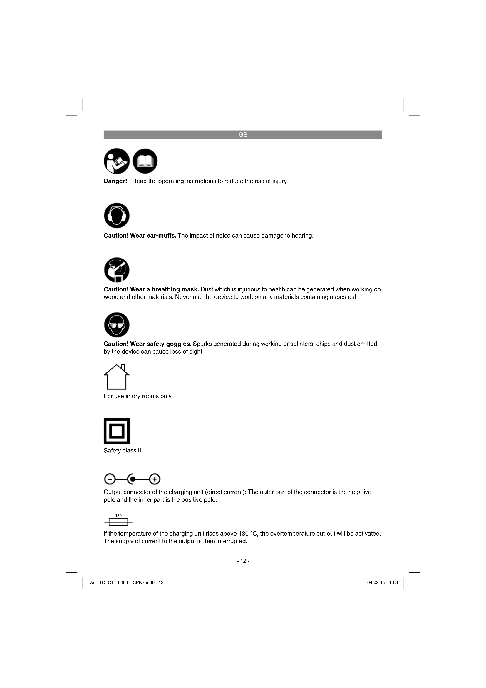 Danger! - Read the operating instructions to reduce the risk of injury Caution! Wear ear-muff s. The impact of noise can cause damage to hearing. Caution! Wear safety goggles. Sparks generated during working or splinters, chips and dust emitted by the device can cause loss of sight. Caution! Wear a breathing mask. Dust which is injurious to health can be generated when working on wood and other materials. Never use the device to work on any materials containing asbestos! For use in dry rooms only Safety class II Output connector of the charging unit (direct current): The outer part of the connector is the negative pole and the inner part is the positive pole. 130° If the temperature of the charging unit rises above 130 °C, the overtemperature cut-out will be activated. The supply of current to the output is then interrupted. Anl_TC_CT_3_6_Li_SPK7.indb 12Anl_TC_CT_3_6_Li_SPK7.indb 12 04.09.15 13:3704.09.15 13:37GB