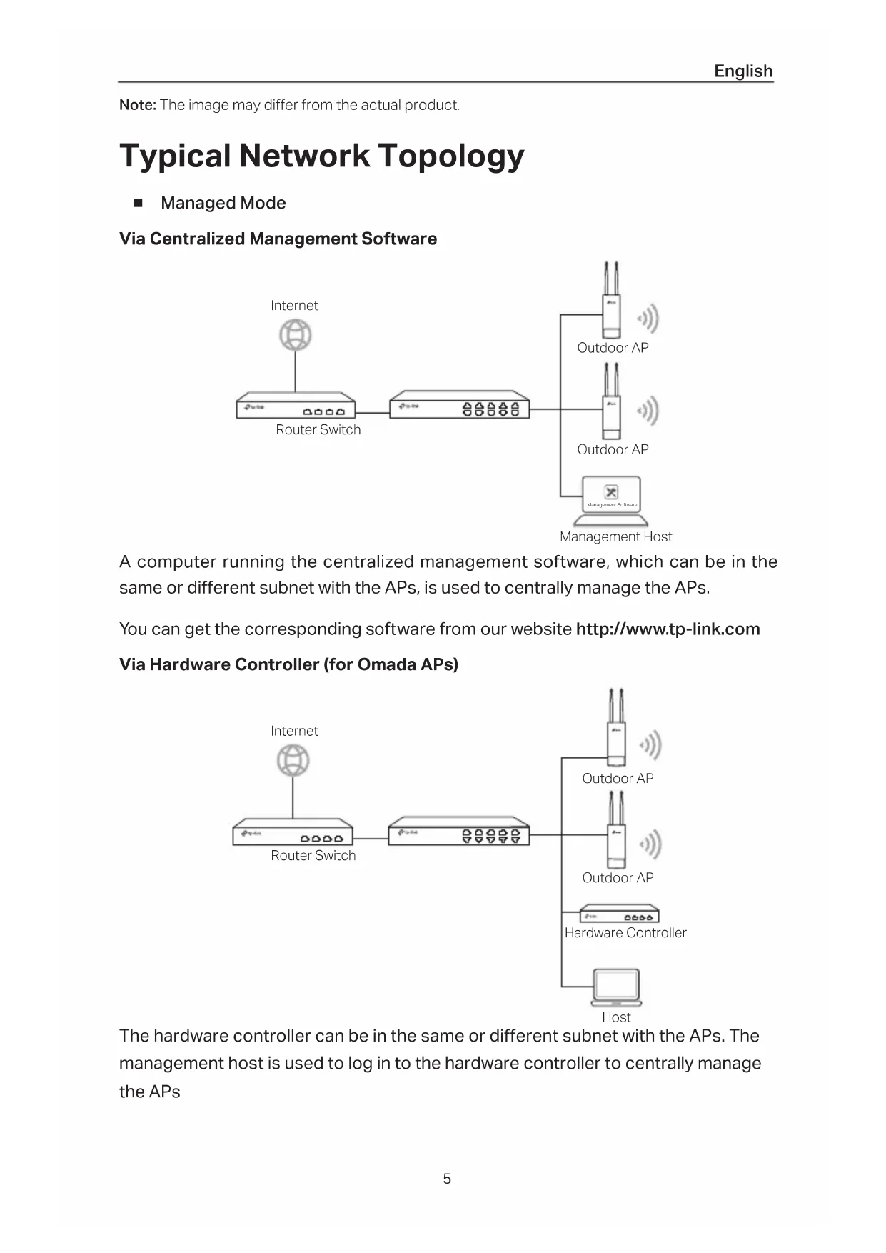 Note: The image may dier from the actual product. Typical Network Topology ■ Managed Mode Via Centralized Management Software Management Software A computer running the centralized management software, which can be in the same or dierent subnet with the APs, is used to centrally manage the APs. You can get the corresponding software from our website http://www.tp-link.com Via Hardware Controller (for Omada APs) The hardware controller can be in the same or dierent subnet with the APs. The management host is used to log in to the hardware controller to centrally manage the APs Router Switch Internet Management Host Outdoor AP Outdoor AP Router Switch Internet Outdoor AP Outdoor AP Hardware Controller HostEnglish