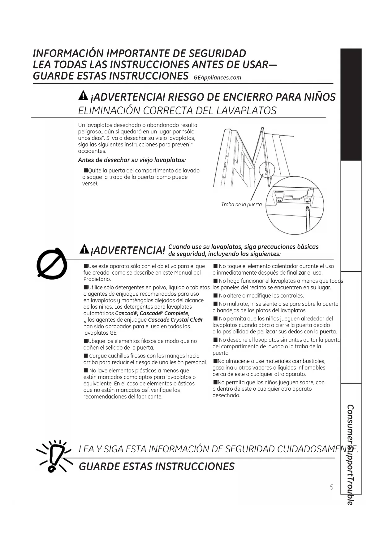 Door latch keeper ■ Use this appliance only for its intended purpose as described in this Owner’s Manual. ■ Use only powder, tabs, liquid detergents or rinse agents recommended for use in a dishwasher and keep them out of the reach of children. Cascade , Cascade Complete Automatic Dishwashing Detergents, and Cascade Crystal Clear rinse agents have been approved for use in all GE dishwashers. ■ Locate sharp items so that they are not likely to damage the door seal. ■ Load sharp knives with the handles up to reduce the risk of cut-type injuries. ■ Do not wash plastic items unless marked dishwasher safe or the equivalent. For plastic items not so marked, check the manufacturer’s recommendations. ■ Do not touch the heating element during or immediately after use. ■ Do not operate your dishwasher unless all enclosure panels are properly in place. ■ Do not tamper with controls. ■ Do not abuse, sit on or stand on the door or dish rack of the dishwasher. ■ Do not allow children to play around the dishwasher when opening or closing the door due to the possibility of small fingers being pinched in the door. ■ Do not discard a dishwasher without first removing the door of the washing compartment or the latch keeper. ■ Do not store or use combustible materials, gasoline or other flammable vapors and liquids in the vicinity of this or any other appliance. ■ Do not allow children to play with, on or inside this or any discarded appliance. WARNING! When using your dishwasher, follow basic precautions, including the following: READ AND FOLLOW THIS SAFETY INFORMATION CAREFULLY.