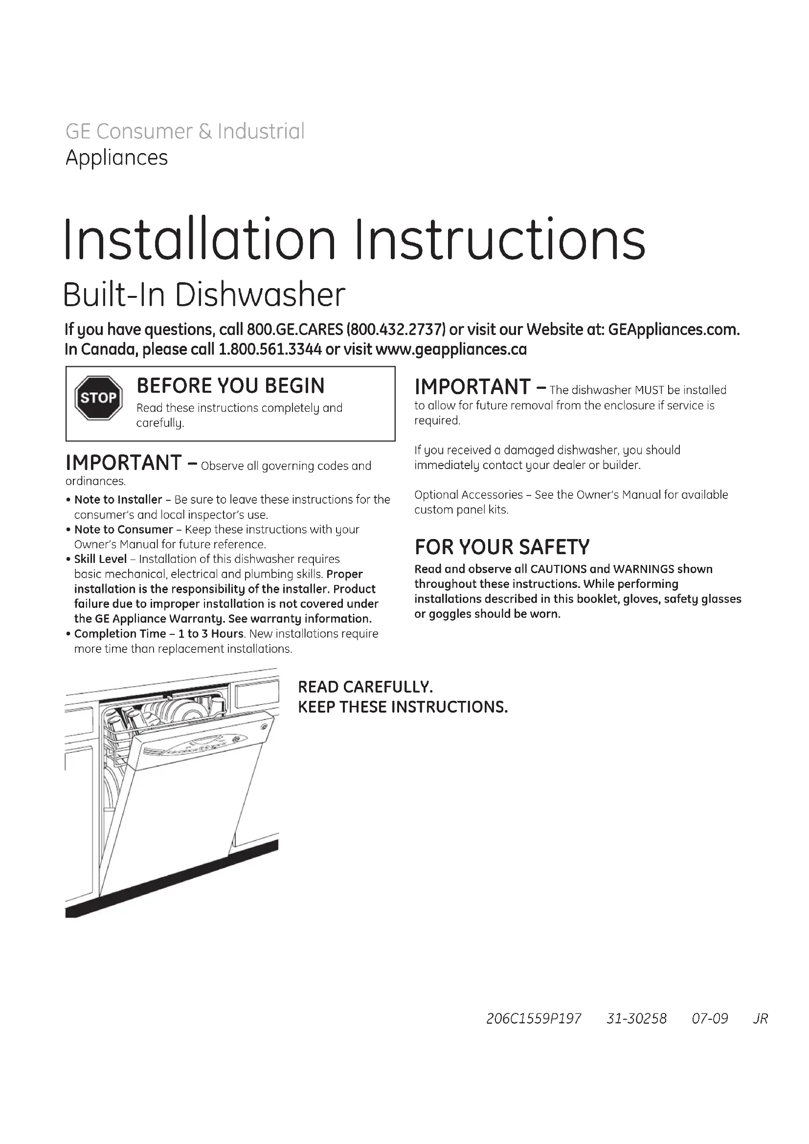 GE Consumer & Industrial Appliances Installation Instructions Built-In Dishwasher If you have questions, call 800.GE.CARES (800.432.2737) or visit our Website at: GEAppliances.com. In Canada, please call 1.800.561.3344 or visit www.geappliances.ca IMPORTANT – The dishwasher MUST be installed to allow for future removal from the enclosure if service is required.If you received a damaged dishwasher, you should immediately contact your dealer or builder.Optional Accessories – See the Owner’s Manual for available custom panel kits.