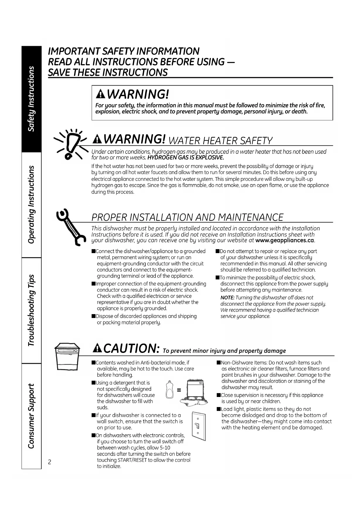 This dishwasher must be properly installed and located in accordance with the Installation Instructions before it is used. If you did not receive an Installation Instructions sheet with your dishwasher, you can receive one by visiting our website at www.geappliances.ca. ■ Contents washed in Anti-bacterial mode, ifavailable, may be hot to the touch. Use carebefore handling.■ Using a detergent that isnot specifically designedfor dishwashers will causethe dishwasher to fill withsuds.■ If your dishwasher is connected to awall switch, ensure that the switch ison prior to use.■ On dishwashers with electronic controls,if you choose to turn the wall switch offbetween wash cycles, allow 5-10seconds after turning the switch on beforetouching START/RESET to allow the control to initialize.■ Non-Dishware Items: Do not wash items such as electronic air cleaner filters, furnace filters andpaint brushes in your dishwasher. Damage to thedishwasher and discoloration or staining of thedishwasher may result.■ Close supervision is necessary if this appliance is used by or near children.■ Load light, plastic items so they do not become dislodged and drop to the bottom ofthe dishwasher—they might come into contactwith the heating element and be damaged.■ Connect the dishwasher/appliance to a groundedmetal, permanent wiring system; or run anequipment-grounding conductor with the circuitconductors and connect to the equipment-grounding terminal or lead of the appliance.■ Improper connection of the equipment-groundingconductor can result in a risk of electric shock.Check with a qualified electrician or servicerepresentative if you are in doubt whether theappliance is properly grounded.■ Dispose of discarded appliances and shipping or packing material properly. ■ Do not attempt to repair or replace any part of your dishwasher unless it is specificallyrecommended in this manual. All other servicingshould be referred to a qualified technician.■ To minimize the possibility of electric shock,disconnect this appliance from the power supplybefore attempting any maintenance. NOTE: Turning the dishwasher off does notdisconnect the appliance from the power supply.We recommend having a qualified technicianservice your appliance. WARNING! CAUTION: To prevent minor injury and property damage Under certain conditions, hydrogen gas may be produced in a water heater that has not been used for two or more weeks. HYDROGEN GAS IS EXPLOSIVE. If the hot water has not been used for two or more weeks, prevent the possibility of damage or injury by turning on all hot water faucets and allow them to run for several minutes. Do this before using anyelectrical appliance connected to the hot water system. This simple procedure will allow any built-uphydrogen gas to escape. Since the gas is flammable, do not smoke, use an open flame, or use the applianceduring this process.geappliances.ca Consumer SupportTroubleshooting TipsOperating InstructionsSafety Instructions