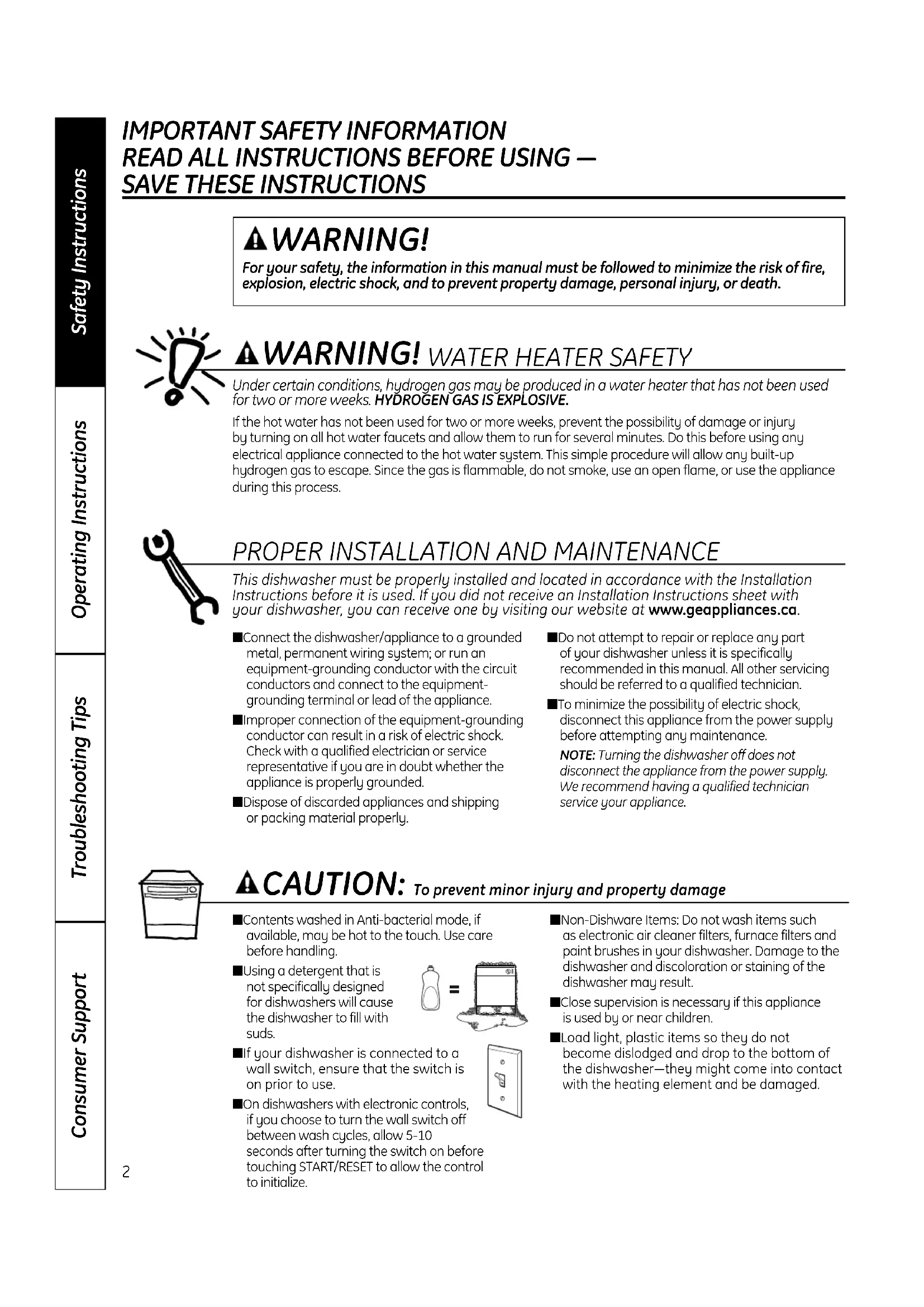This dishwasher must be properly installed and located in accordance with the Installation Instructions before it is used. If you did not receive an Installation Instructions sheet with your dishwasher, you can receive one by visiting our website at www.geappliances.ca. ■ Contents washed in Anti-bacterial mode, ifavailable, may be hot to the touch. Use carebefore handling.■ Using a detergent that isnot specifically designedfor dishwashers will causethe dishwasher to fill withsuds.■ If your dishwasher is connected to awall switch, ensure that the switch ison prior to use.■ On dishwashers with electronic controls,if you choose to turn the wall switch offbetween wash cycles, allow 5-10seconds after turning the switch on beforetouching START/RESET to allow the control to initialize.■ Non-Dishware Items: Do not wash items such as electronic air cleaner filters, furnace filters andpaint brushes in your dishwasher. Damage to thedishwasher and discoloration or staining of thedishwasher may result.■ Close supervision is necessary if this appliance is used by or near children.■ Load light, plastic items so they do not become dislodged and drop to the bottom ofthe dishwasher—they might come into contactwith the heating element and be damaged.■ Connect the dishwasher/appliance to a groundedmetal, permanent wiring system; or run anequipment-grounding conductor with the circuitconductors and connect to the equipment-grounding terminal or lead of the appliance.■ Improper connection of the equipment-groundingconductor can result in a risk of electric shock.Check with a qualified electrician or servicerepresentative if you are in doubt whether theappliance is properly grounded.■ Dispose of discarded appliances and shipping or packing material properly. ■ Do not attempt to repair or replace any part of your dishwasher unless it is specificallyrecommended in this manual. All other servicingshould be referred to a qualified technician.■ To minimize the possibility of electric shock,disconnect this appliance from the power supplybefore attempting any maintenance. NOTE: Turning the dishwasher off does notdisconnect the appliance from the power supply.We recommend having a qualified technicianservice your appliance. WARNING! CAUTION: To prevent minor injury and property damage Under certain conditions, hydrogen gas may be produced in a water heater that has not been used for two or more weeks. HYDROGEN GAS IS EXPLOSIVE. If the hot water has not been used for two or more weeks, prevent the possibility of damage or injury by turning on all hot water faucets and allow them to run for several minutes. Do this before using anyelectrical appliance connected to the hot water system. This simple procedure will allow any built-uphydrogen gas to escape. Since the gas is flammable, do not smoke, use an open flame, or use the applianceduring this process.geappliances.ca Consumer SupportTroubleshooting TipsOperating InstructionsSafety Instructions