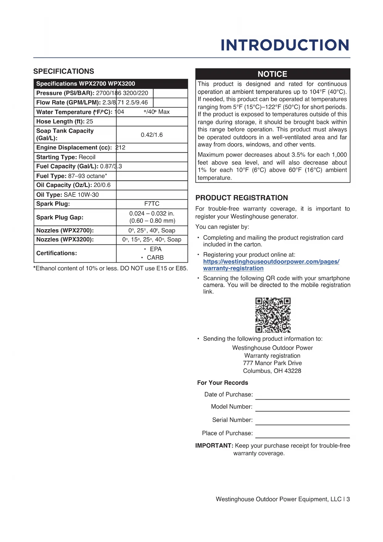 - CARB *Ethanol content of 10% or less. DO NOT use E15 or E85. NOTICE This product is designed and rated for continuous operation at ambient temperatures up to 104°F (40°C). If needed, this product can be operated at temperatures ranging from 5°F (15°C)–122°F (50°C) for short periods. If the product is exposed to temperatures outside of this range during storage, it should be brought back within this range before operation. This product must always be operated outdoors in a well-ventilated area and far away from doors, windows, and other vents. Maximum power decreases about 3.5% for each 1,000 feet above sea level, and will also decrease about 1% for each 10°F (6°C) above 60°F (16°C) ambient temperature. PRODUCT REGISTRATION For trouble-free warranty coverage, it is important to register your Westinghouse generator. You can register by: