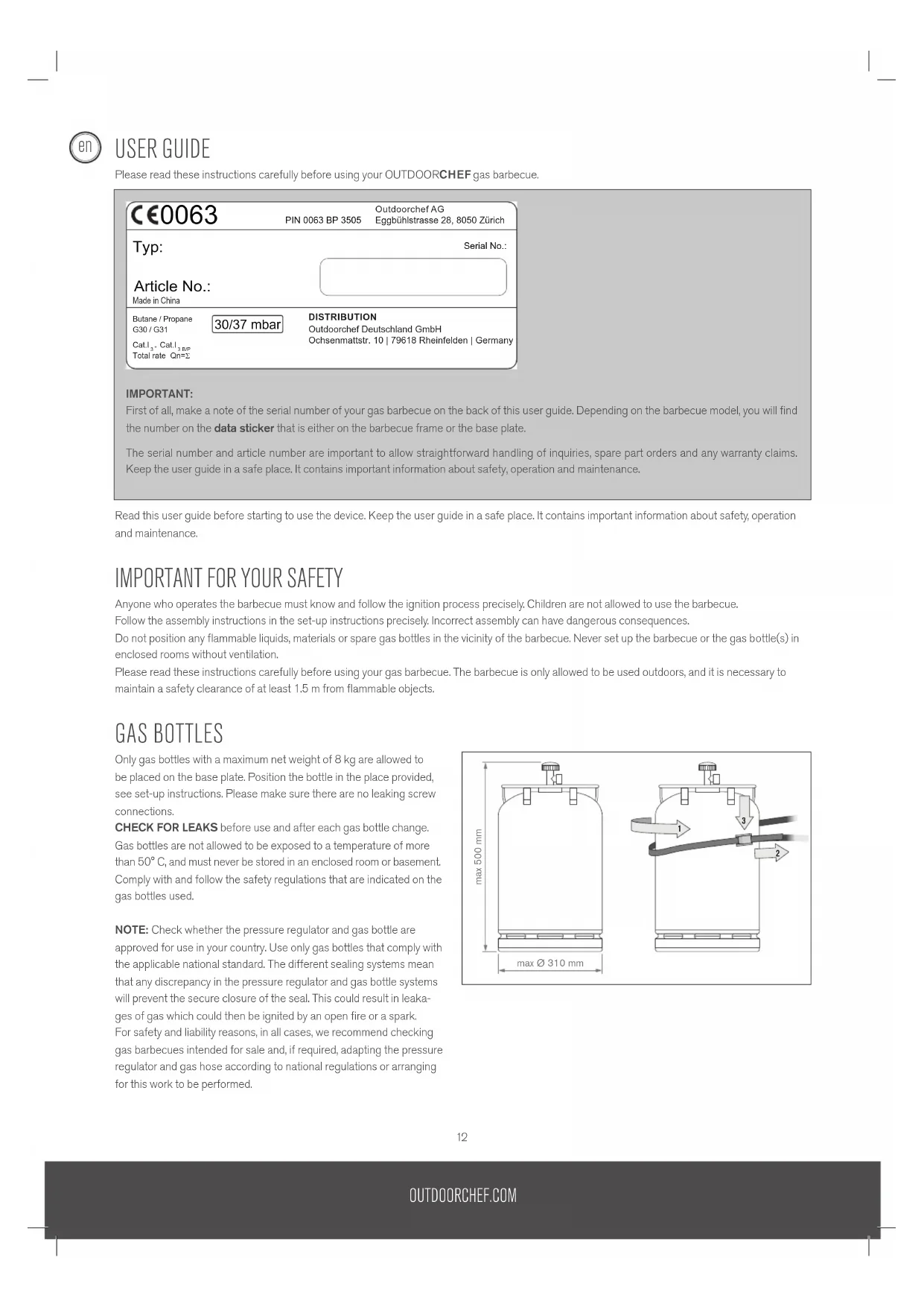 IMPORTANT: First of all, make a note of the serial number of your gas barbecue on the back of this user guide. Depending on the barbecue model, you will find the number on the data sticker that is either on the barbecue frame or the base plate. The serial number and article number are important to allow straightforward handling of inquiries, spare part orders and any warranty claims. Keep the user guide in a safe place. It contains important information about safety, operation and maintenance. Total rate Qn=Σ Typ: PIN 0063 BP 3505Outdoorchef AGEggbühlstrasse 28, 8050 Zürich