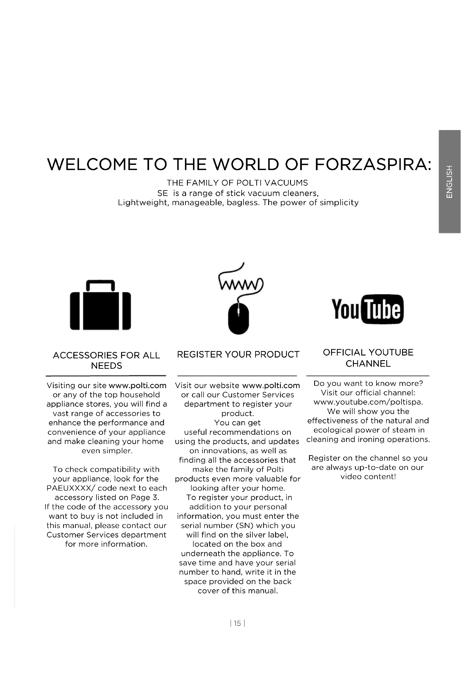 NEEDS Visiting our site www.polti.com or any of the top household appliance stores, you will find a vast range of accessories to enhance the performance and convenience of your appliance and make cleaning your home even simpler. To check compatibility with your appliance, look for the PAEUXXXX/ code next to each accessory listed on Page 3. If the code of the accessory you want to buy is not included in this manual, please contact our Customer Services department for more information. OFFICIAL YOUTUBE CHANNEL Do you want to know more? Visit our official channel: www.youtube.com/poltispa. We will show you the effectiveness of the natural and ecological power of steam in cleaning and ironing operations. Register on the channel so you are always up-to-date on our video content!