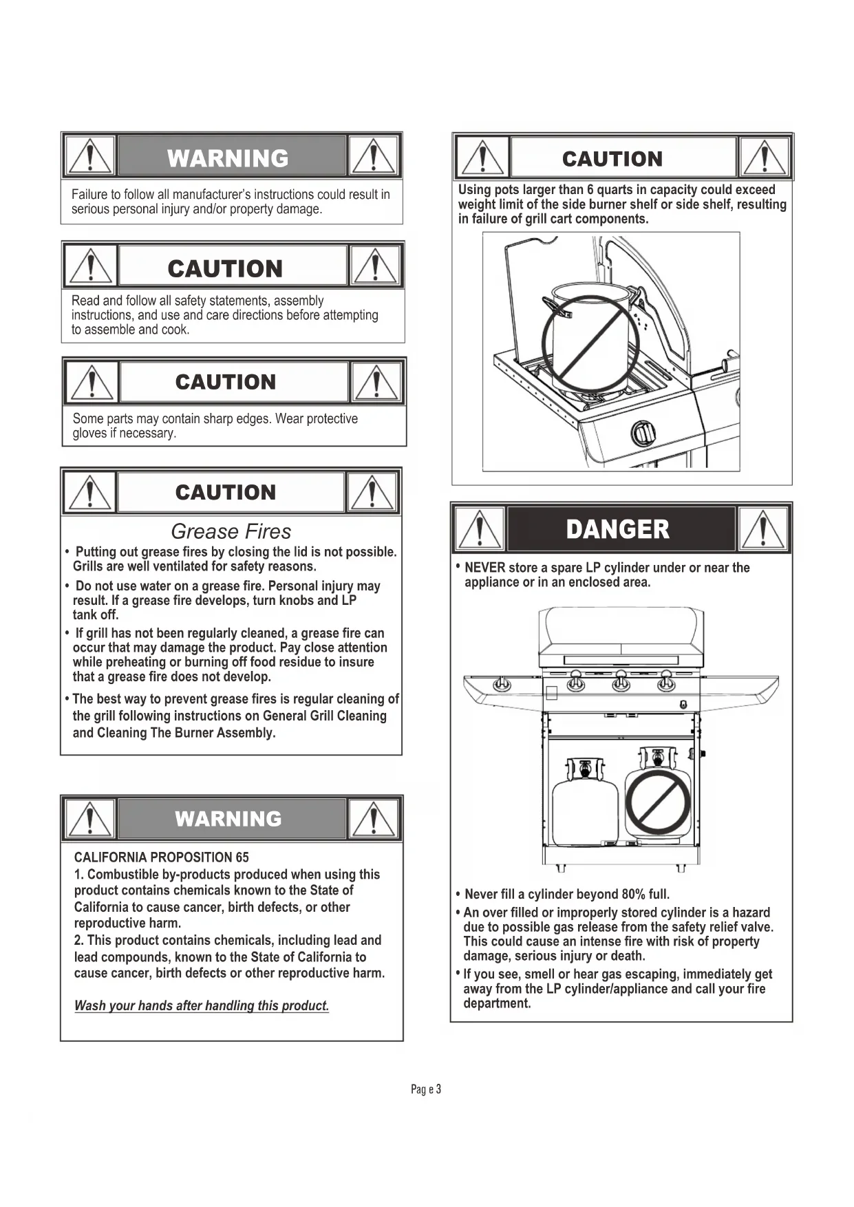 - -63 Registration Card Pag e 3Failure to follow all manufacturer’s instructions could result in serious personal injury and/or property damage. WARNING Read and follow all safety statements, assembly instructions, and use and care directions before attempting to assemble and cook. CAUTION CAUTION Some parts may contain sharp edges. Wear protective gloves if necessary. CAUTION Grease Fires p. 71