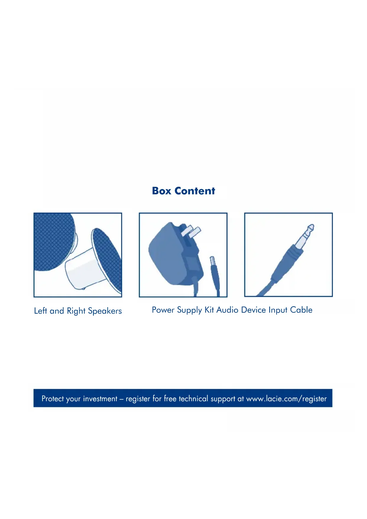 Speakers DESIGN BY NEIL POULTONBox Content Protect your investment – register for free technical support at www.lacie.com/register Left and Right Speakers Power Supply Kit Audio Device Input Cable1. Cable to connect to primary speaker