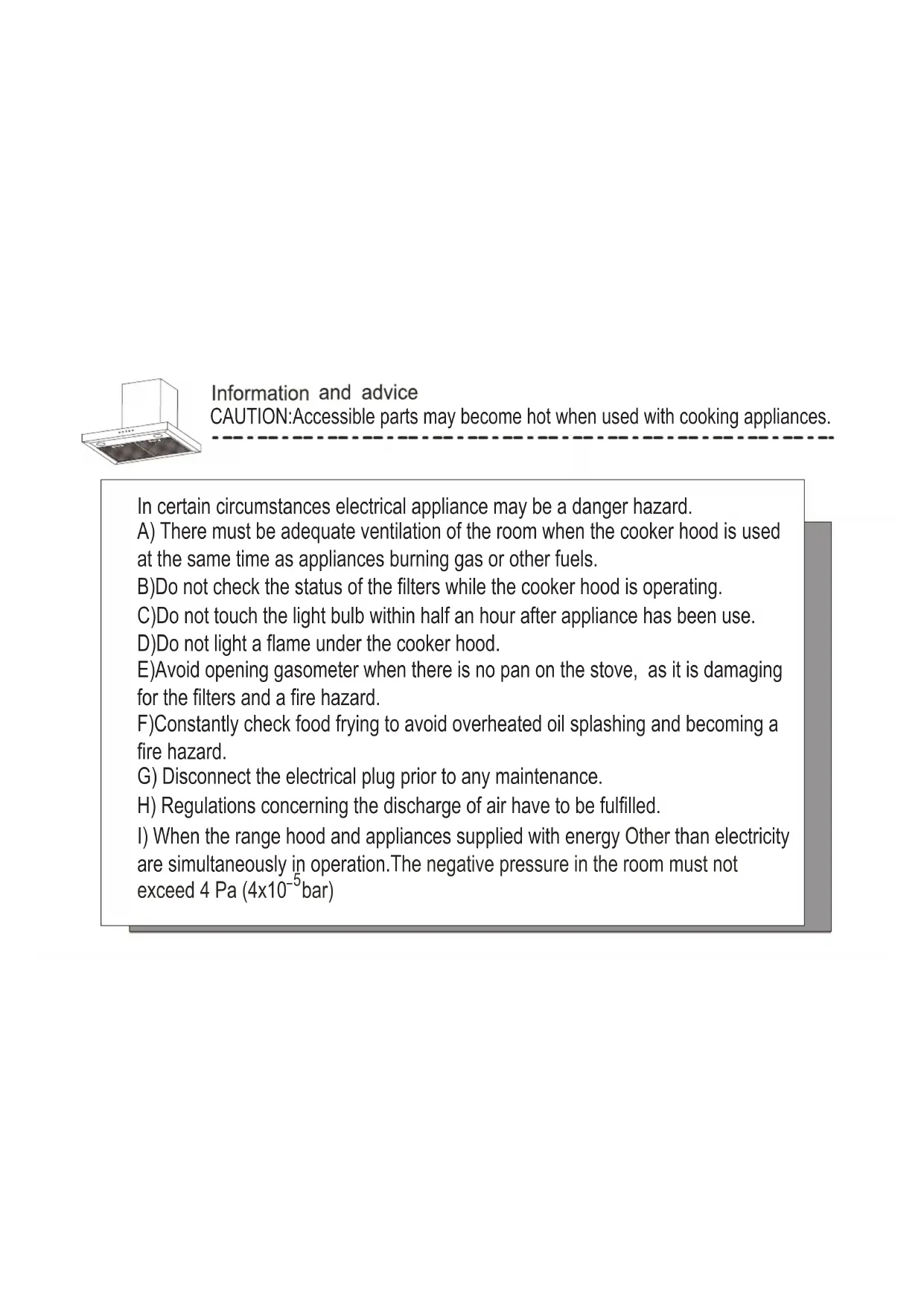 5J)If the supply cord is damaged,it must be replaced by the manufacturer,its service agent or similarly qualified persons in order to avoid a hazard. K)This appliance can be used by children aged from 8 years and above and persons with reduced physical, sensory or mental capabilities or lack of experience and knowledge if they have been given supervision or instruction concerning use of the appliance in a safe way and understand the hazards involved. Children shall not play with the appliance. Cleaning and user maintenance shall not be made by children unless they are older than 8 and supervised. L)the range hood is inteded to be installed over a hob having no more than four hob elements. M) Indoor use and household use only O) Attention ! Observe the warning in the instruction sheet concerning the operation of the appliance when air is discharged from the room N)When the appliance is not in use and before cleaning, unplug the appliance from the outlet. CAUTION:Accessible parts may become hot when used with cooking appliances. P) There is a fire risk if cleaning is not carried out in accordance with the instructions.CAUTION:Accessible parts may become hot when used with cooking appliances. Q) The air must not be discharged into a flue that is used for exhausting fumes from appliances burning gas or other fuels (not applicable to appliances that only discharge the air back into the room. I)Children should be supervised to ensure that they do not play with the appliance. S)Warning: Failure to install the screws or fixing device in accordance with these instructions may result in electrical hazards. T)The installation height of hood shall not be less than 65cm. U)The filter screen must be cleaned regularly, otherwise there is a danger of fire. V)The installation must be carried out according to the screws and positions required by the instructions, which will easily damage the connecting wires. W)If the supply cord is damaged, it must be replaced by the manufacturer, its service agent or similarly qualified persons in order to avoid a hazard.Know your cook er hood Please read these instructions Before using your cooker hood Congratulations on the purchase of our Cooker hood, which is designed to include many superior features that permit you the fullest expression of your living. Before installing and/or using the cooker hood carefully read all the instructions.