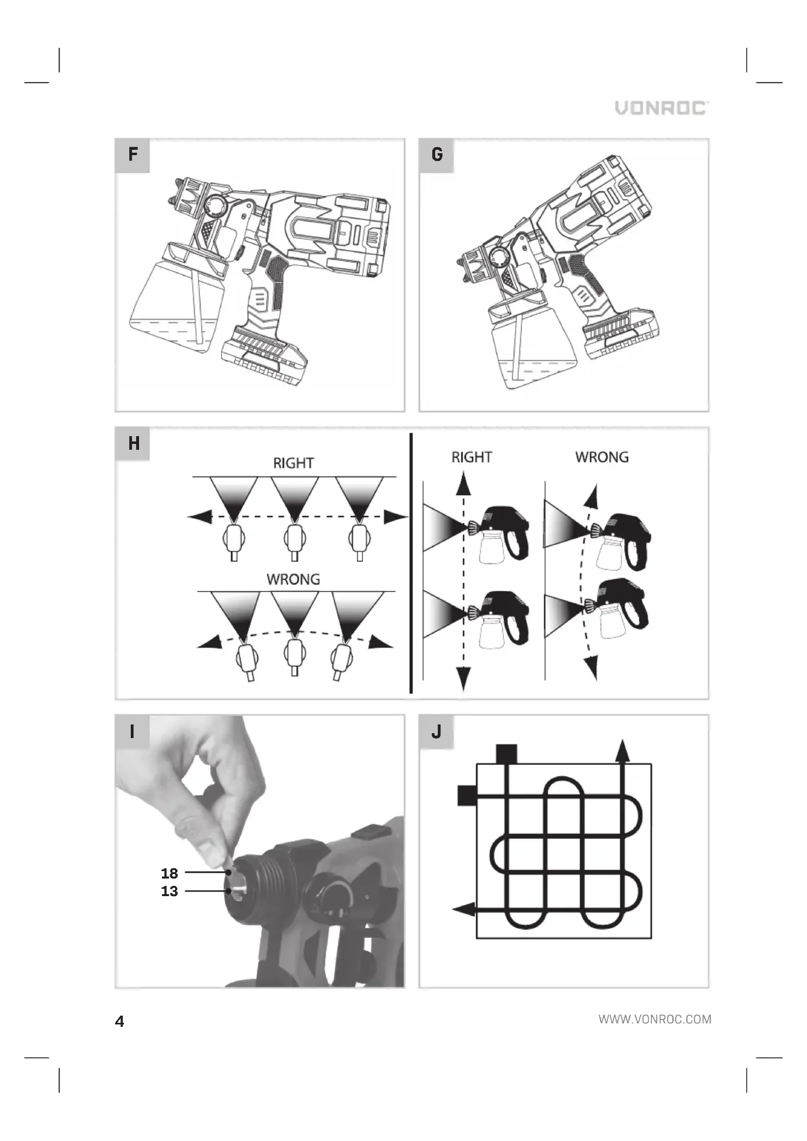 and pull the trigger (1). Hold the front of the spray gun around 20-30 cm away from the to be sprayed surface. Make long arm movements rather than short wrist movements like show in figure H. The most suitable method of surface spraying is with a cross-pattern, starting with horizontal passes and finishing with light verti- cal passes. See figure J.