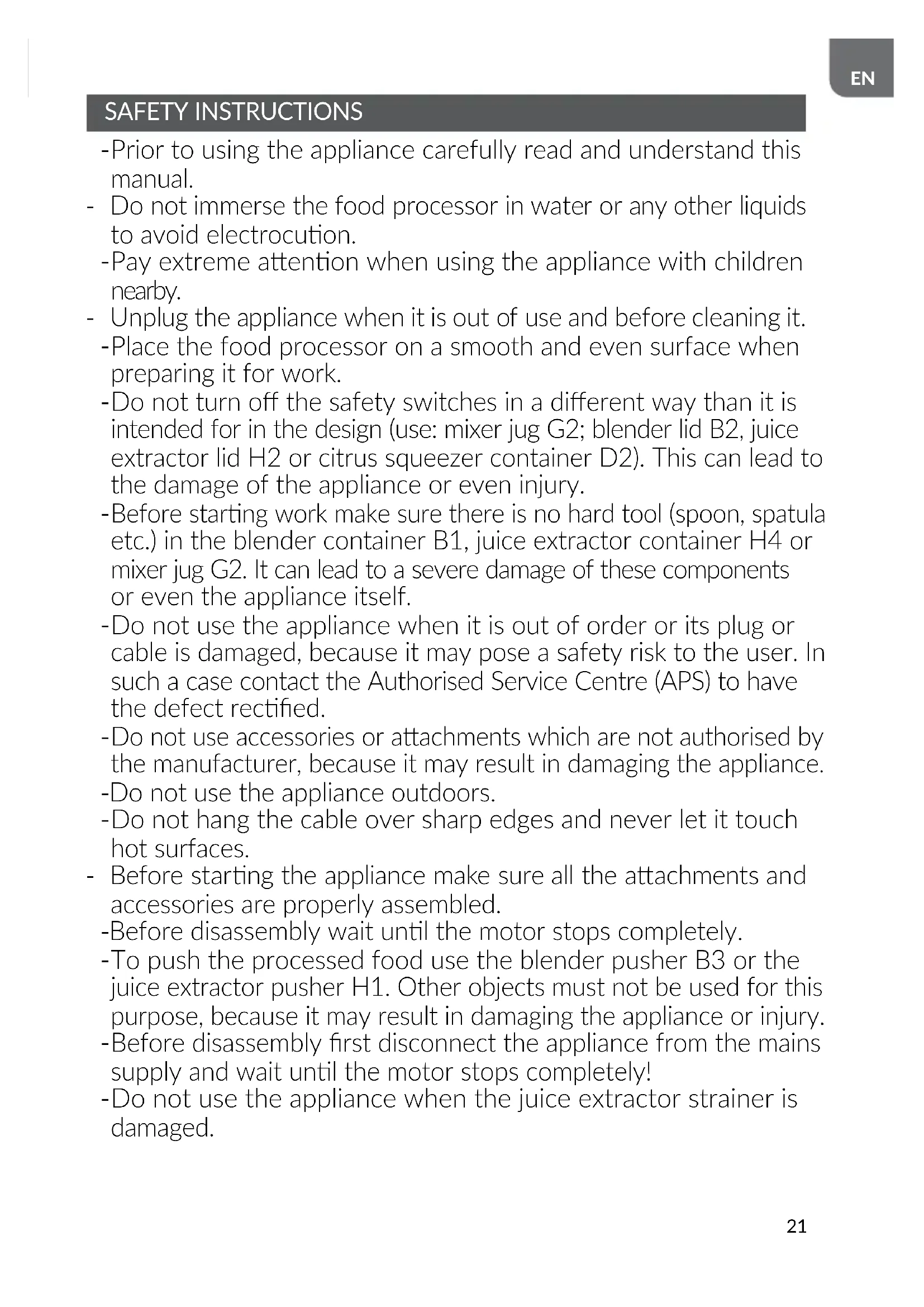 Do not turn o the safety switches in a dierent way than it is intended for in the design (use: mixer jug G2; blender lid B2, juice extractor lid H2 or citrus squeezer container D2). This can lead to the damage of the appliance or even injury.