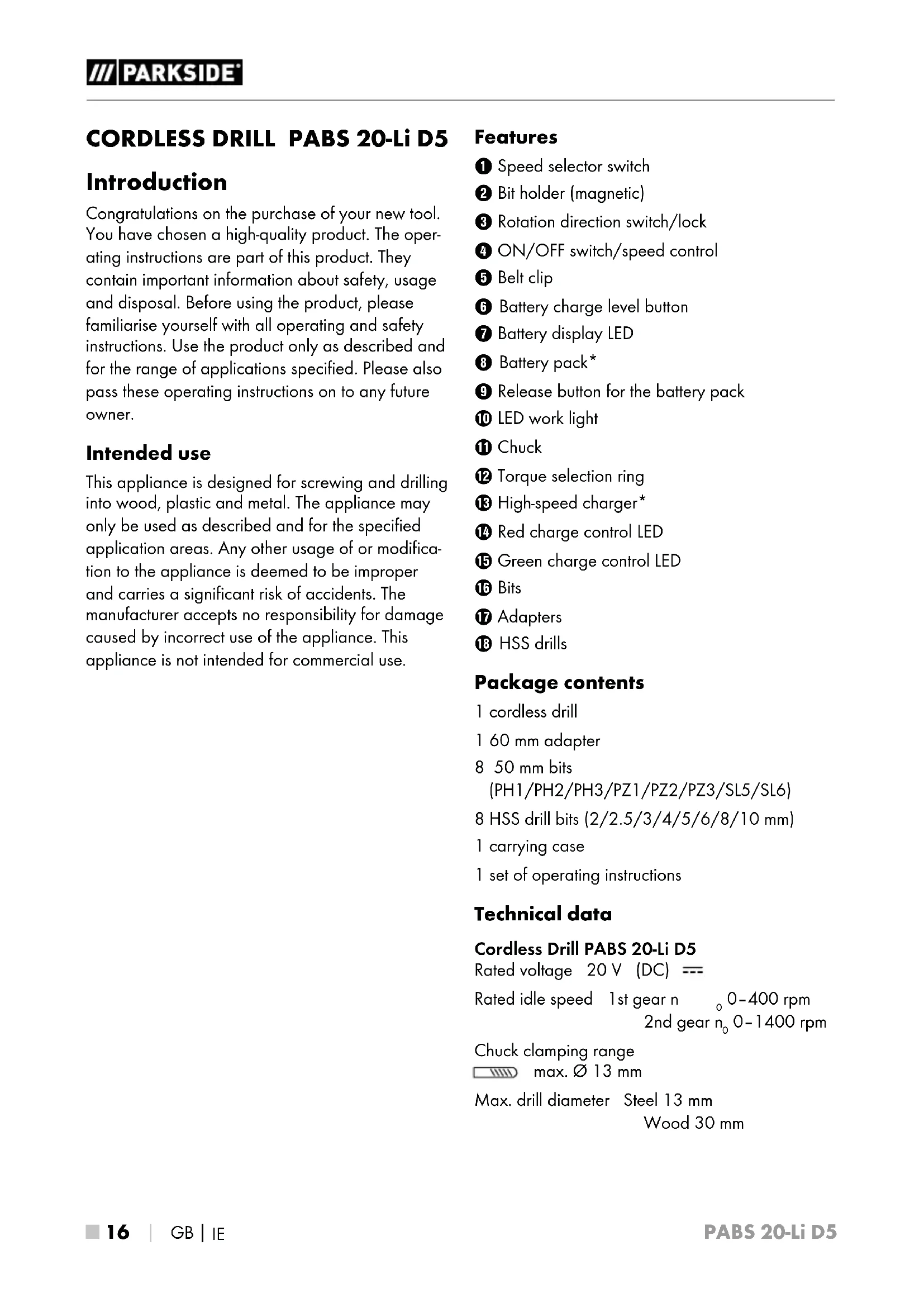 CORDLESS DRILL PABS 20-Li D5 Introduction Congratulations on the purchase of your new tool. You have chosen a high-quality product. The oper- ating instructions are part of this product. They contain important information about safety, usage and disposal. Before using the product, please familiarise yourself with all operating and safety instructions. Use the product only as described and for the range of applications specified. Please also pass these operating instructions on to any future owner. Intended use This appliance is designed for screwing and drilling into wood, plastic and metal. The appliance may only be used as described and for the specified application areas. Any other usage of or modifica- tion to the appliance is deemed to be improper and carries a significant risk of accidents. The manufacturer accepts no responsibility for damage caused by incorrect use of the appliance. This appliance is not intended for commercial use. Features Speed selector switch Bit holder (magnetic) Rotation direction switch/lock ON/OFF switch/speed control Belt clip Battery charge level button Battery display LED Battery pack* Release button for the battery pack LED work light - Chuck 3 Torque selection ring ! High-speed charger* . Red charge control LED 0 Green charge control LED 6 Bits 1 Adapters %HSS drills Package contents 1 cordless drill 1 60 mm adapter 8 50 mm bits (PH1/PH2/PH3/PZ1/PZ2/PZ3/SL5/SL6) 8 HSS drill bits (2/2.5/3/4/5/6/8/10 mm) 1 carrying case 1 set of operating instructions Technical data Cordless Drill PABS 20-Li D5 Rated voltage 20 V (DC) Rated idle speed 1st gear n