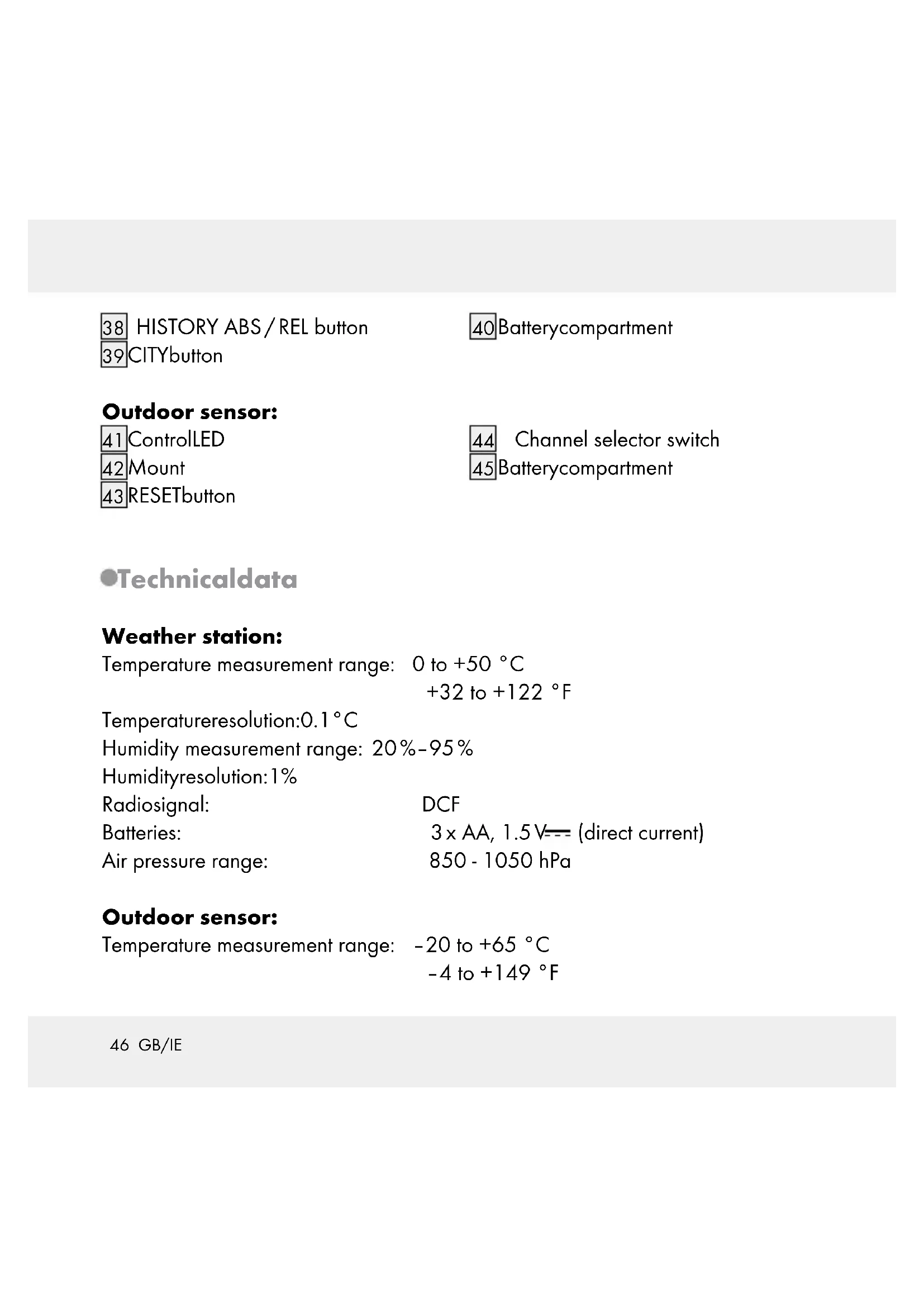Battery compartment Technical data Weather station: Temperature measurement range: 0 to +50 °C +32 to +122 °F Temperature resolution: 0.1 °C Humidity measurement range: 20 %–95 % Humidity resolution: 1 % Radio signal: DCF Batteries: 3 x AA, 1.5 V (direct current) Air pressure range: 850 - 1050 hPa Outdoor sensor: Temperature measurement range: –20 to +65 °C –4 to +149 °F47 GB/IE Humidity measurement range: 20 %–95 % Humidity resolution: 1 % HF transmission signal: 433 MHz HF transmission range: max. 30 metres (in open area) Batteries: 2 x AA, 1.5 V (direct current) Degree of protection: IPX4 (splash-proof) Included items 1 Weather station 1 Outdoor sensor 3 Batteries AA, 1.5 V (pre-installed) 2 Batteries AA, 1.5 V (pre-installed) 1 Operating instructions Safety Please read all safety information and instructions. Failure to comply with the safety information and instructions may result in an electric shock, fire and / or severe injuries. KEEP ALL THE SAFETY ADVICE AND INSTRUCTIONS IN A SAFE PLACE FOR