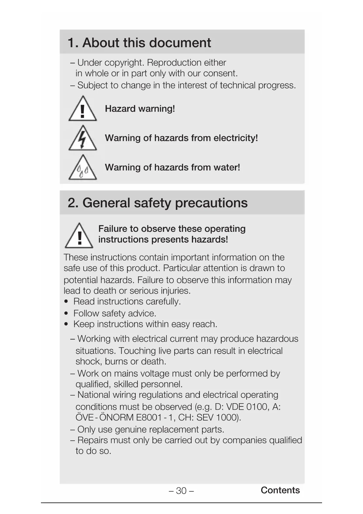 - Keep instructions within easy reach. – Working with electrical current may produce hazardous situations. Touching live parts can result in electrical shock, burns or death. – Work on mains voltage must only be performed by qualified, skilled personnel. – National wiring regulations and electrical operating conditions must be observed (e.g. D: VDE 0100, A: ÖVE - ÖNORM E8001 - 1, CH:SEV 1000). – Only use genuine replacement parts. – Repairs must only be carried out by companies qualified to do so.– 31 – Contents