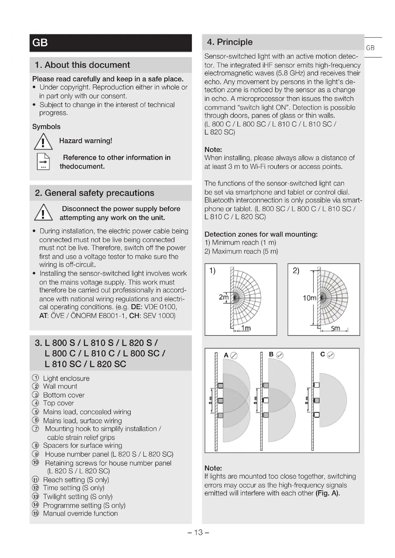 Sensor-switched light with an active motion detec-tor. The integrated iHF sensor emits high-frequency electromagnetic waves (5.8GHz) and receives their echo. Any movement by persons in the light's de-tection zone is noticed by the sensor as a change in echo. A microprocessor then issues the switch command “switch light ON”. Detection is possible through doors, panes of glass or thin walls.(L800C / L800SC / L810C / L810SC / L820SC)Note:When installing, please always allow a distance of at least 3 m to Wi-Fi routers or access points.The functions of the sensor-switched light can be set via smartphone and tablet or control dial. Bluetooth interconnection is only possible via smart-phone or tablet. (L800SC/ L800C/ L810SC/ L810C/ L820SC)Detection zones for wall mounting:1) Minimum reach (1m)2) Maximum reach (5m)