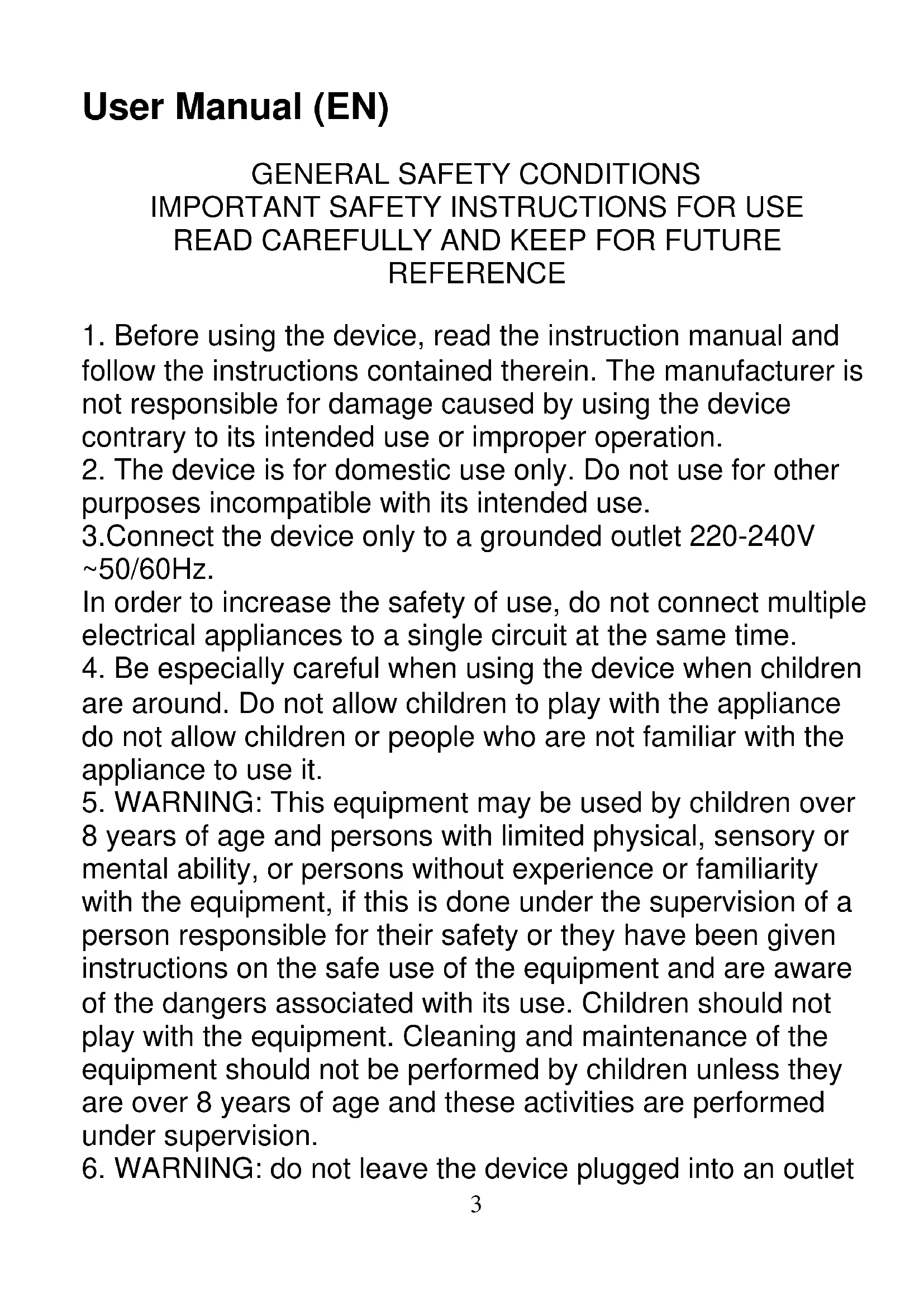 purposes incompatible with its intended use. 3.Connect the device only to a grounded outlet 220-240V ~50/60Hz. In order to increase the safety of use, do not connect multiple electrical appliances to a single circuit at the same time.