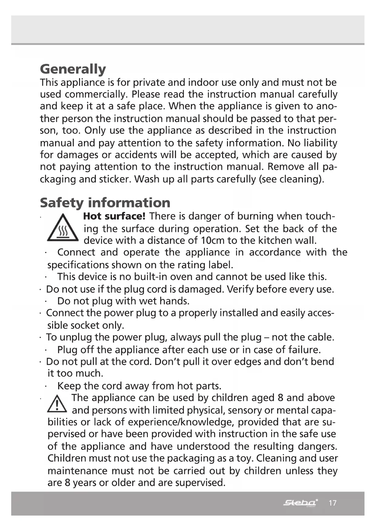 This appliance is for private and indoor use only and must not be used commercially. Please read the instruction manual carefully and keep it at a safe place. When the appliance is given to another person the instruction manual should be passed to that person, too. Only use the appliance as described in the instruction manual and pay attention to the safety information. No liability for damages or accidents will be accepted, which are caused by not paying attention to the instruction manual. Remove all packaging and sticker. Wash up all parts carefully (see cleaning).