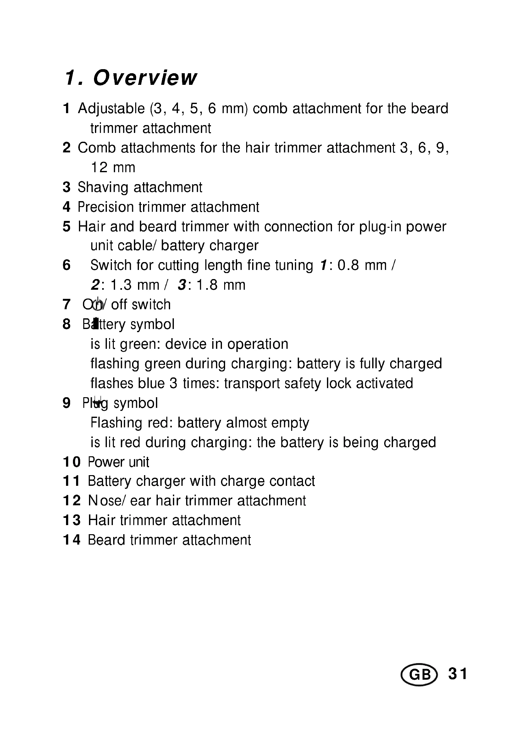 1 Adjustable (3, 4, 5, 6 mm) comb attachment for the beard trimmer attachment 2 Comb attachments for the hair trimmer attachment 3, 6, 9, 12 mm 3 Shaving attachment 4 Precision trimmer attachment 5 Hair and beard trimmer with connection for plug-in power unit cable/battery charger 6 Switch for cutting length fine tuning 1: 0.8 mm / 2: 1.3 mm / 3: 1.8 mm 7 On/off switch 8 Battery symbol is lit green: device in operation flashing green during charging: battery is fully charged flashes blue 3 times: transport safety lock activated 9 Plug symbol Flashing red: battery almost empty is lit red during charging: the battery is being charged 10 Power unit 11 Battery charger with charge contact 12 Nose/ear hair trimmer attachment 13 Hair trimmer attachment 14 Beard trimmer attachment32