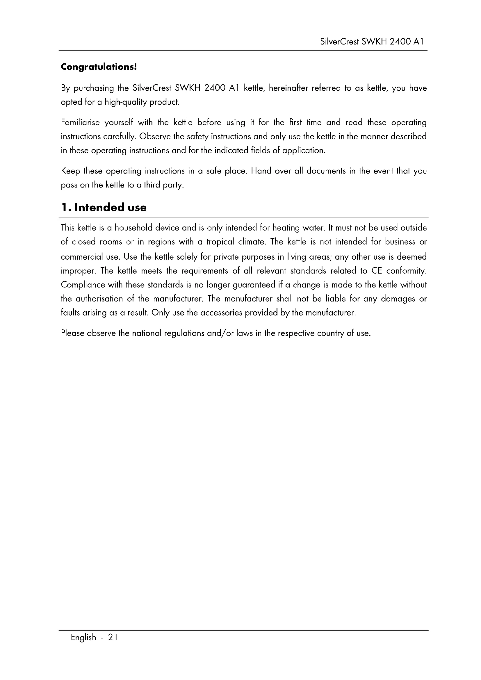 12. Warranty information ................................................................................ 35SilverCrest SWKH 2400 A1 English - 21 Congratulations! By purchasing the SilverCrest SWKH 2400 A1 kettle, hereinafter referred to as kettle, you have opted for a high-quality product. Familiarise yourself with the kettle before using it for the first time and read these operating instructions carefully. Observe the safety instructions and only use the kettle in the manner described in these operating instructions and for the indicated fields of application. Keep these operating instructions in a safe place. Hand over all documents in the event that you pass on the kettle to a third party.