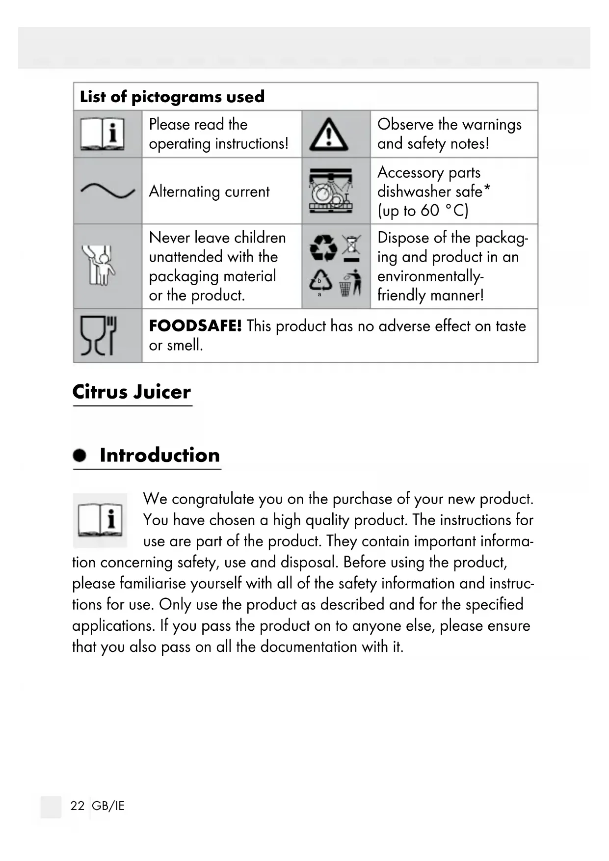 Dispose of the packag- ing and product in an environmentally- friendly manner! FOOD SAFE! This product has no adverse effect on taste or smell. Citrus Juicer Introduction We congratulate you on the purchase of your new product. You have chosen a high quality product. The instructions for use are part of the product. They contain important informa- tion concerning safety, use and disposal. Before using the product, please familiarise yourself with all of the safety information and instruc- tions for use. Only use the product as described and for the specified applications. If you pass the product on to anyone else, please ensure that you also pass on all the documentation with it.23 GB/IE Intended use The product is exclusively intended for squeezing citrus fruits. Any use other than described above or any modification of the product is pro- hibited and will result in damage. The manufacturer assumes no liability for damages due to improper use. This product is not intended for commercial use. Parts description