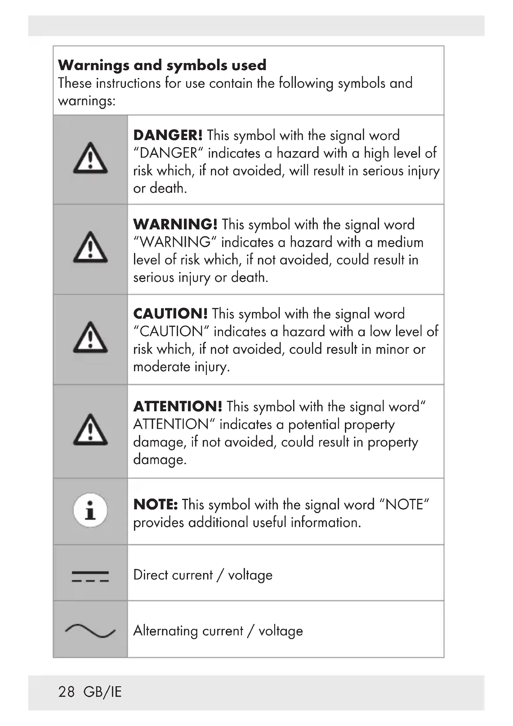 Warnings and symbols used.. Page 28