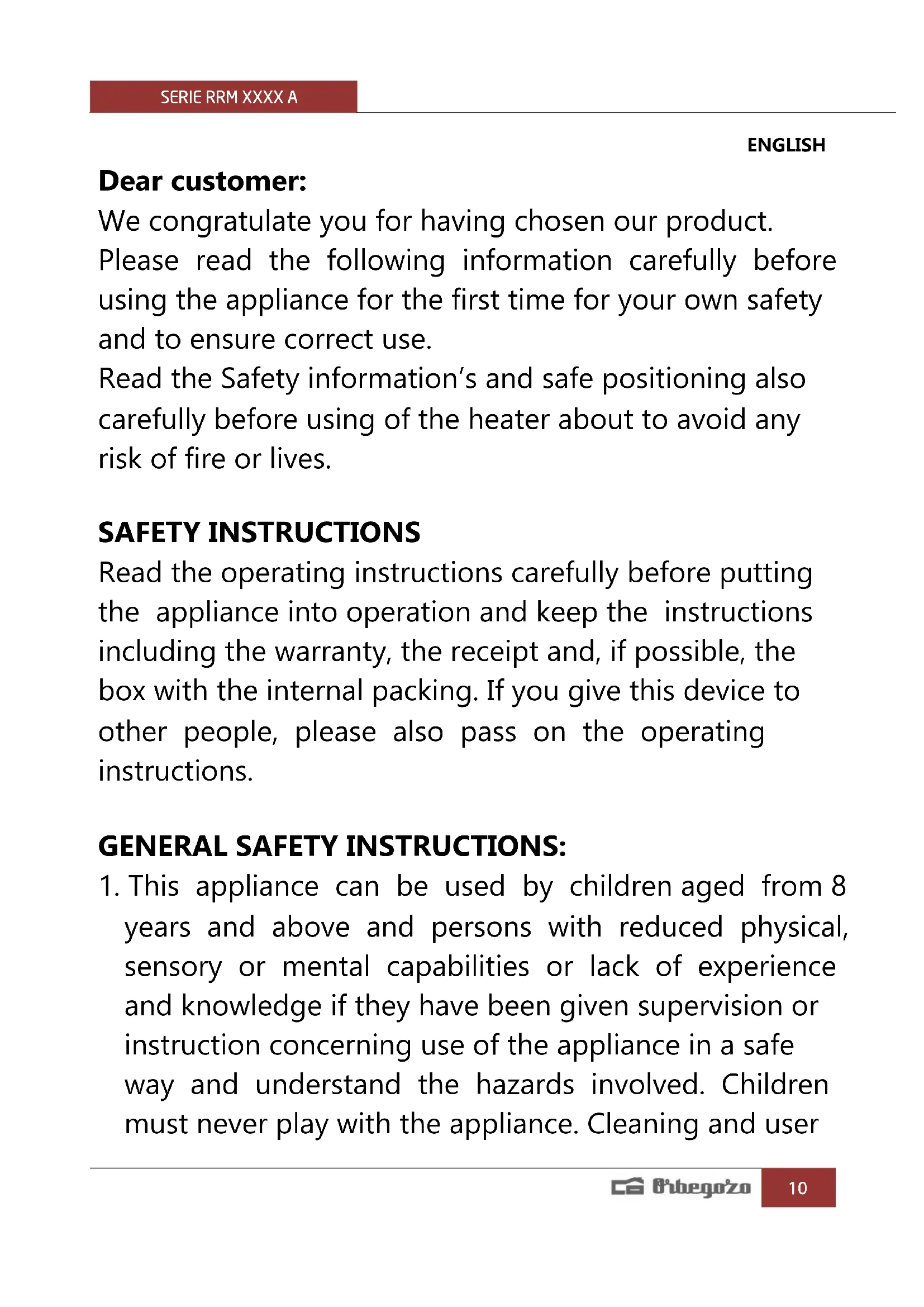 USER MANUAL RRM 1310 Orbegozo