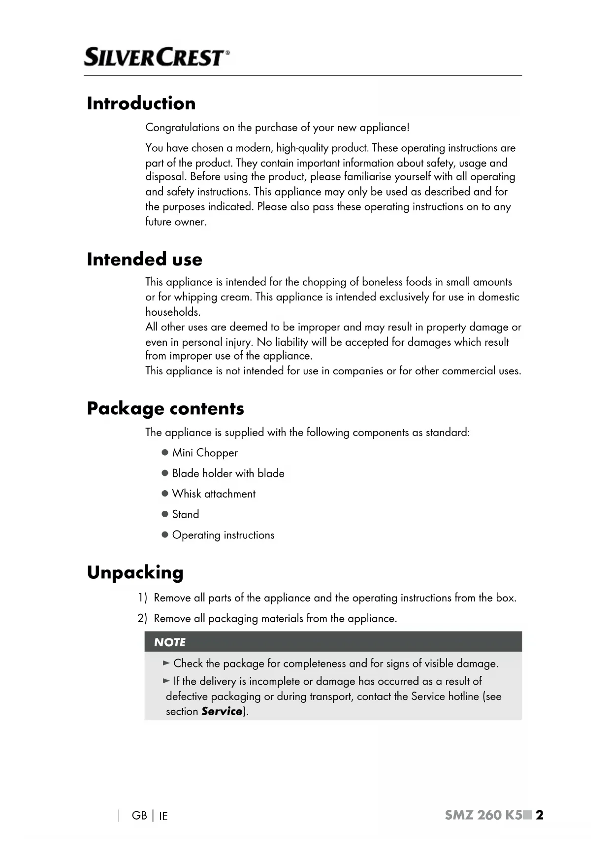 NOTE ► Check the package for completeness and for signs of visible damage. ► If the delivery is incomplete or damage has occurred as a result of defective packaging or during transport, contact the Service hotline (see section Service).SMZ 260 K5 GB