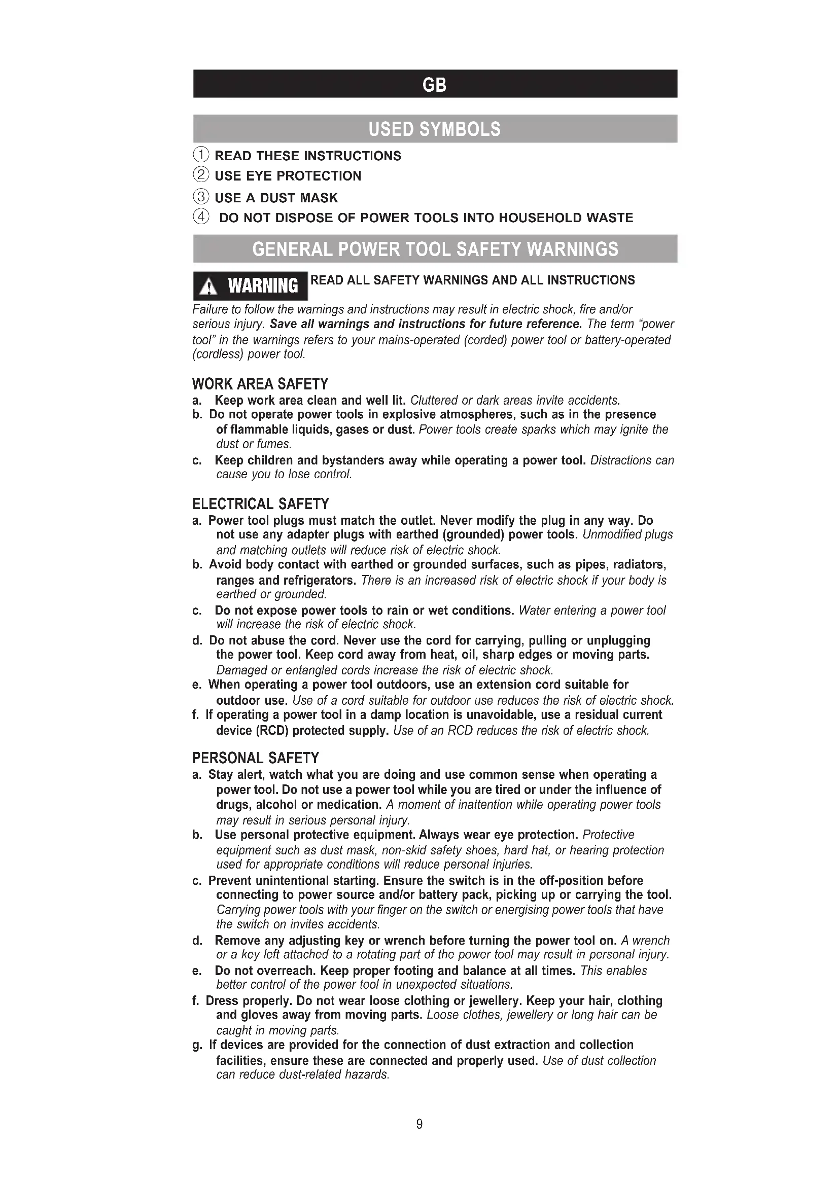 a. Keep work area clean and well lit. Cluttered or dark areas invite accidents. b. Do not operate power tools in explosive atmospheres, such as in the presence of ammable liquids, gases or dust. Power tools create sparks which may ignite the dust or fumes. c. Keep children and bystanders away while operating a power tool. Distractions can cause you to lose control. ELECTRICAL SAFETY a. Power tool plugs must match the outlet. Never modify the plug in any way. Do not use any adapter plugs with earthed (grounded) power tools. Unmodied plugs and matching outlets will reduce risk of electric shock. b. Avoid body contact with earthed or grounded surfaces, such as pipes, radiators, ranges and refrigerators. There is an increased risk of electric shock if your body is earthed or grounded. c. Do not expose power tools to rain or wet conditions. Water entering a power tool will increase the risk of electric shock. d. Do not abuse the cord. Never use the cord for carrying, pulling or unplugging the power tool. Keep cord away from heat, oil, sharp edges or moving parts. Damaged or entangled cords increase the risk of electric shock. e. When operating a power tool outdoors, use an extension cord suitable for outdoor use. Use of a cord suitable for outdoor use reduces the risk of electric shock. f. If operating a power tool in a damp location is unavoidable, use a residual current device (RCD) protected supply. Use of an RCD reduces the risk of electric shock. PERSONAL SAFETY a. Stay alert, watch what you are doing and use common sense when operating a power tool. Do not use a power tool while you are tired or under the inuence of drugs, alcohol or medication. A moment of inattention while operating power tools may result in serious personal injury. b. Use personal protective equipment. Always wear eye protection. Protective equipment such as dust mask, non-skid safety shoes, hard hat, or hearing protection used for appropriate conditions will reduce personal injuries. c. Prevent unintentional starting. Ensure the switch is in the off-position before connecting to power source and/or battery pack, picking up or carrying the tool. Carrying power tools with your nger on the switch or energising power tools that have the switch on invites accidents. d. Remove any adjusting key or wrench before turning the power tool on. A wrench or a key left attached to a rotating part of the power tool may result in personal injury. e. Do not overreach. Keep proper footing and balance at all times. This enables better control of the power tool in unexpected situations. f. Dress properly. Do not wear loose clothing or jewellery. Keep your hair, clothing and gloves away from moving parts. Loose clothes, jewellery or long hair can be caught in moving parts. g. If devices are provided for the connection of dust extraction and collection facilities, ensure these are connected and properly used. Use of dust collection can reduce dust-related hazards.10