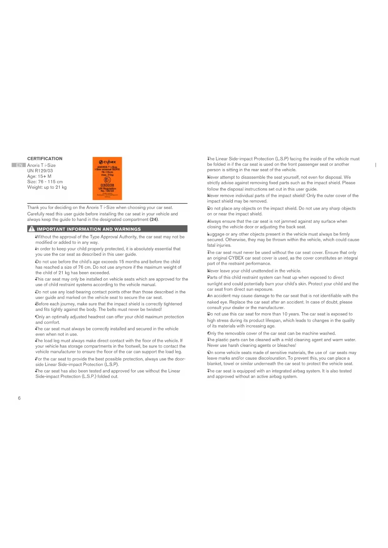 The car seat has also been tested and approved for use without the Linear Side-impact Protection (L.S.P.) folded out. CERTIFICATION Anoris T i-Size UN R129/03 Age: 15+ M Size: 76 - 115 cm Weight: up to 21 kg