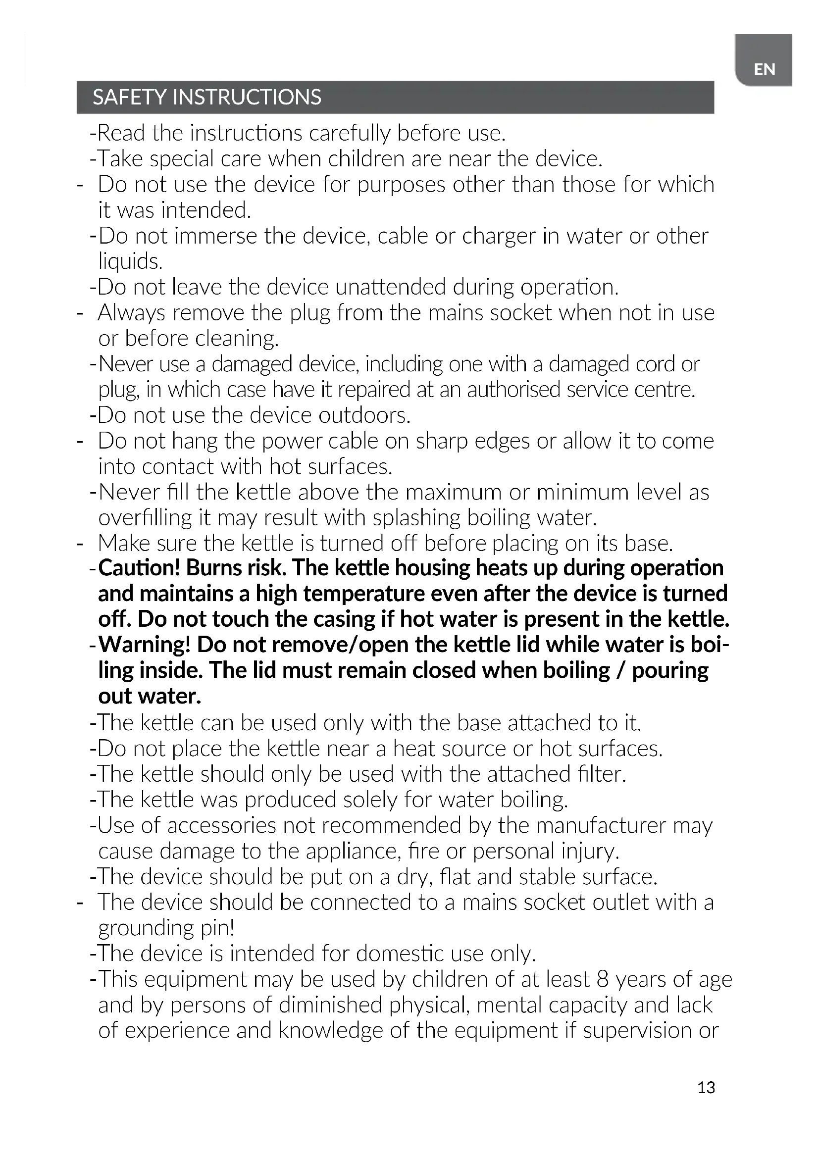 Warning! Do not remove/open the kele lid while water is boi- ling inside. The lid must remain closed when boiling / pouring out water. - The kele can be used only with the base aached to it. - Do not place the kele near a heat source or hot surfaces. - The kele should only be used with the aached lter. - The kele was produced solely for water boiling. - Use of accessories not recommended by the manufacturer may cause damage to the appliance, re or personal injury. - The device should be put on a dry, at and stable surface. - The device should be connected to a mains socket outlet with a grounding pin! - The device is intended for domesc use only.