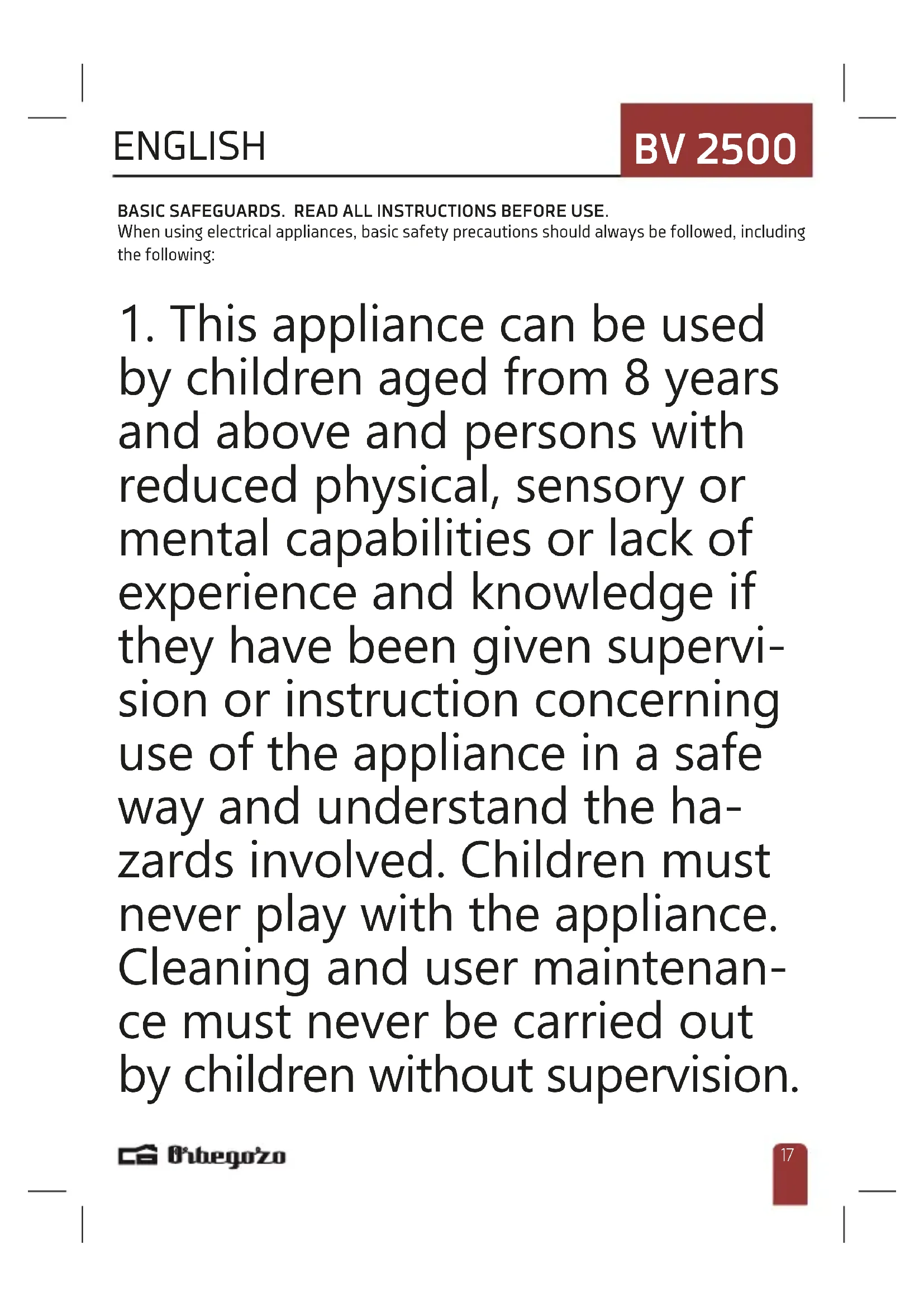 by children aged from 8 years and above and persons with reduced physical, sensory or mental capabilities or lack of experience and knowledge if they have been given supervi- sion or instruction concerning use of the appliance in a safe way and understand the ha- zards involved. Children must never play with the appliance. Cleaning and user maintenan- ce must never be carried out by children without supervision.BV 2500 ENGLISH