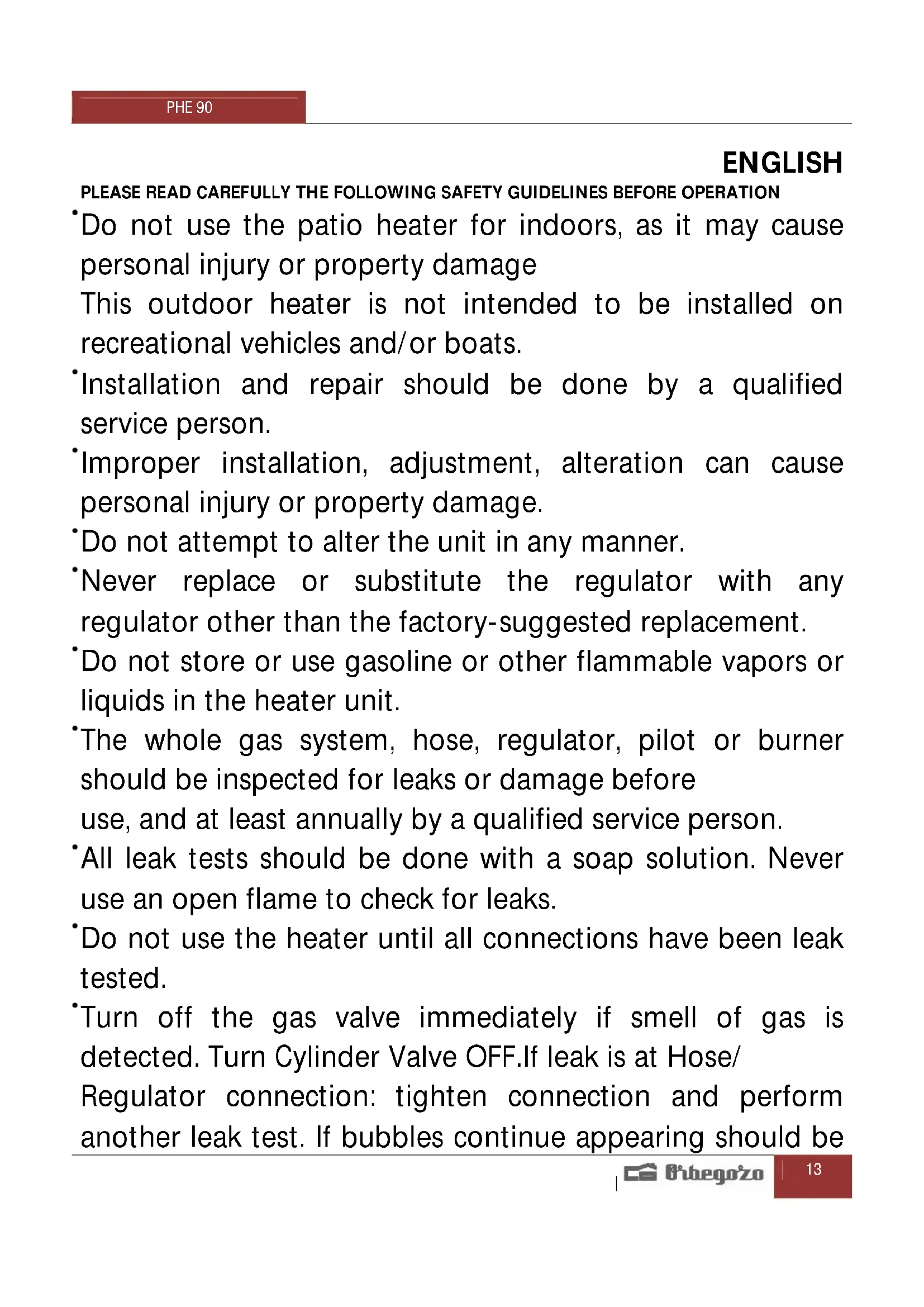 ENGLISH PLEASE READ CAREFULLY THE FOLLOWING SAFETY GUIDELINES BEFORE OPERATION Do not use the patio heater for indoors, as it may cause personal injury or property damage This outdoor heater is not intended to be installed on recreational vehicles and/or boats. Installation and repair should be done by a qualified service person. Improper installation, adjustment, alteration can cause personal injury or property damage. Do not attempt to alter the unit in any manner. Never replace or substitute the regulator with any regulator other than the factory-suggested replacement. Do not store or use gasoline or other flammable vapors or liquids in the heater unit. The whole gas system, hose, regulator, pilot or burner should be inspected for leaks or damage before use, and at least annually by a qualified service person. All leak tests should be done with a soap solution. Never use an open flame to check for leaks. Do not use the heater until all connections have been leak tested. Turn off the gas valve immediately if smell of gas is detected. Turn Cylinder Valve OFF.If leak is at Hose/ Regulator connection: tighten connection and perform another leak test. If bubbles continue appearing should bePHE 90