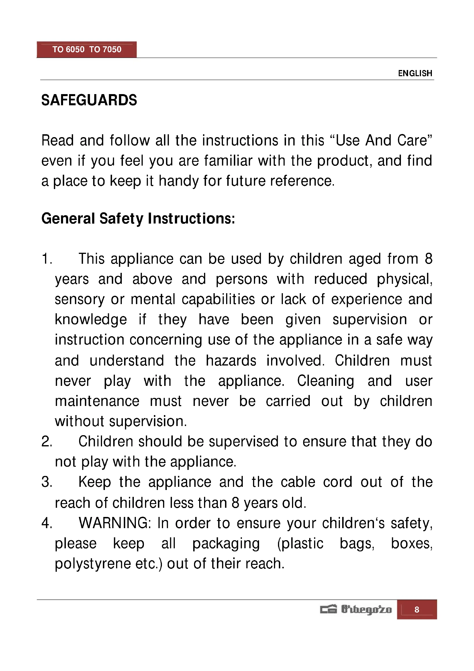 ENGLISH SAFEGUARDS Read and follow all the instructions in this “Use And Care” even if you feel you are familiar with the product, and find a place to keep it handy for future reference. General Safety Instructions: